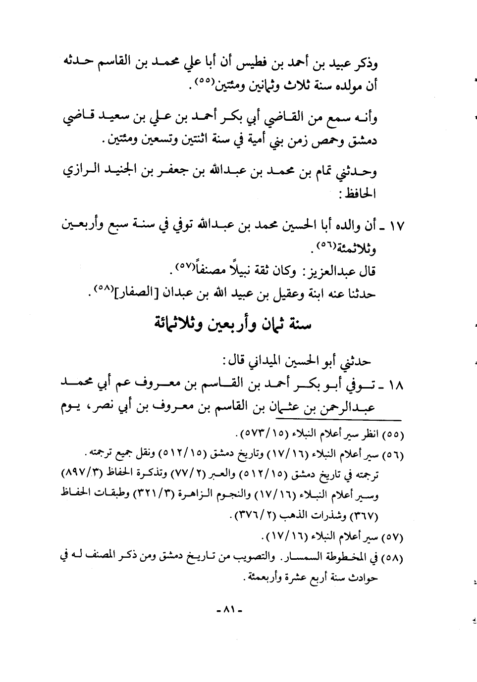 17 - أَن وَالِده أَبَا الْحُسَيْن مُحَمَّد بن عبد الله توفّي فِي سنة سبع وَأَرْبَعين وثلاثمئة