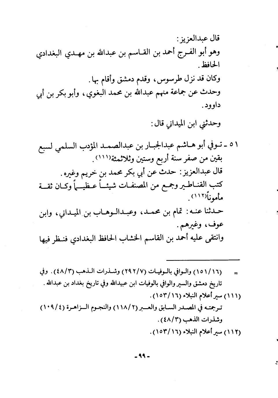 51 - توفّي أَبُو هَاشم عبد الْجَبَّار بن عبد الصَّمد الْمُؤَدب السّلمِيّ لسبع بَقينَ من صفر سنة أَربع وَسِتِّينَ وثلاثمئة