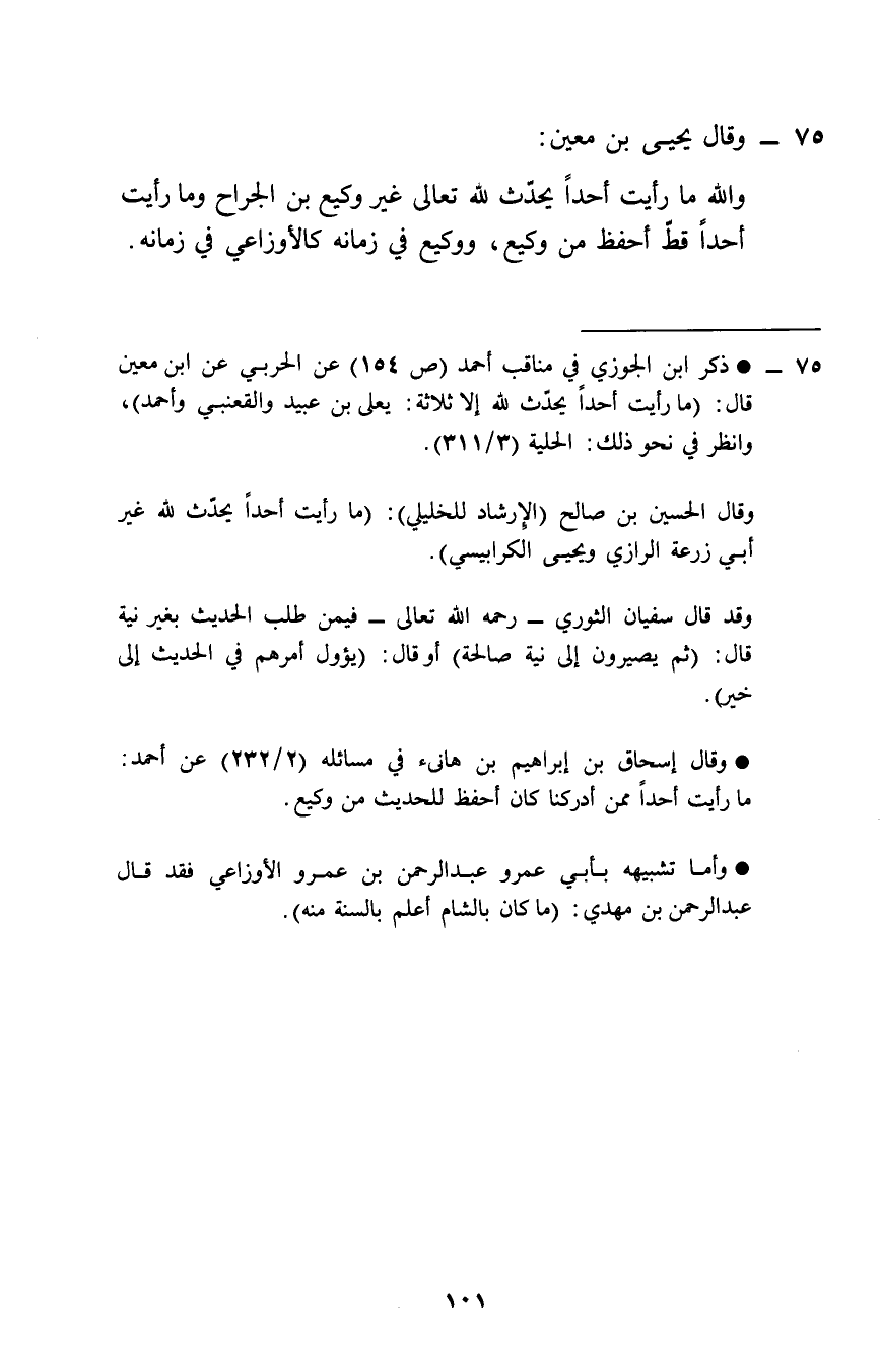 وَالله مَا رَأَيْت أحدا يحدث لله تَعَالَى غير وَكِيع بن الْجراح وَمَا رَأَيْت أحدا قطّ أحفظ من وَكِيع، ووكيع فِي زَمَانه كالأوزاعي فِي زَمَانه.