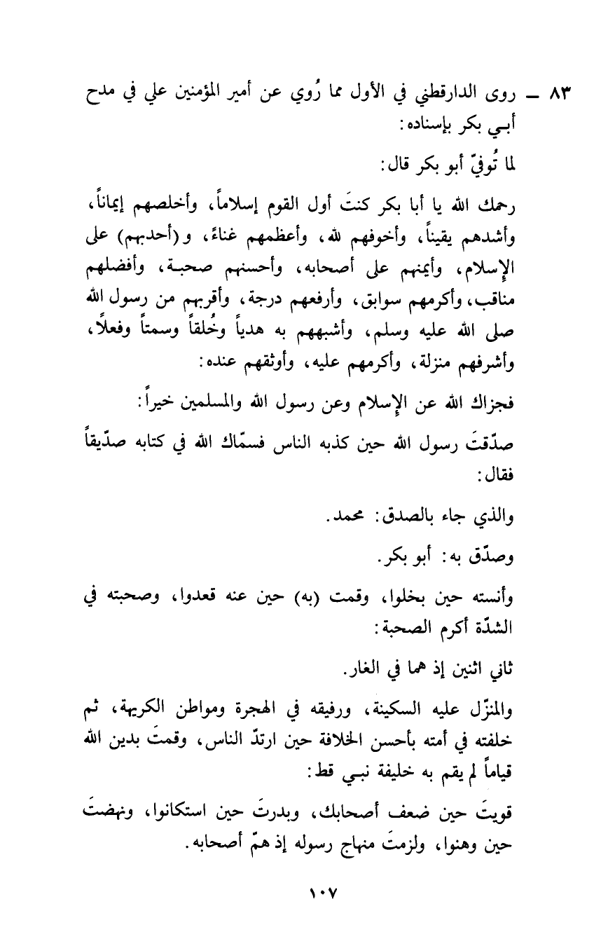 83 - روى الدَّارَقُطْنِيّ فِي الأول مِمَّا رُوِيَ عَن أَمِير الْمُؤمنِينَ عَليّ فِي مدح أبي بكر بِإِسْنَادِهِ: لما توفّي أَبُو بكر قَالَ: رَحِمك الله يَا أَبَا بكر كنت أول الْقَوْم إسلاما، وأخلصهم إِيمَانًا، وأشدهم يَقِينا، وأخوفهم لله، وأعظمهم غناء، و (أحدبهم) على الْإِسْلَام، وأيمنهم على أَصْحَابه، وَأَحْسَنهمْ صُحْبَة، وأفضلهم مَنَاقِب، وَأكْرمهمْ سوابق، وأرفعهم دَرَجَة، وأقربهم من رَسُول الله صلى الله عَلَيْهِ وَسلم، وأشبههم بِهِ هَديا وخلقا وسمتا وفعلا، وأشرفهم منزلَة، وَأكْرمهمْ عَلَيْهِ، وأوثقهم عِنْده: فجزاك الله عَن الْإِسْلَام وَعَن رَسُول الله وَالْمُسْلِمين خيرا: صدقت رَسُول الله حِين كذبه النَّاس فسماك الله فِي كِتَابه صديقا فَقَالَ: وَالَّذِي جَاءَ بِالصّدقِ: مُحَمَّد. وَصدق بِهِ: أَبُو بكر. وأنسته حِين بخلوا، وَقمت (بِهِ) حِين عَنهُ قعدوا، وصحبته فِي الشدَّة أكْرم الصُّحْبَة: ثَانِي اثْنَيْنِ إِذْ هما فِي الْغَار. والمنزل عَلَيْهِ السكينَة، ورفيقه فِي الْهِجْرَة ومواطن الكريهة، ثمَّ خلفته فِي أمته بِأَحْسَن الْخلَافَة حِين ارْتَدَّ النَّاس، وَقمت بدين الله قيَاما لم يقم بِهِ خَليفَة نَبِي قطّ: قويت حِين ضعف أَصْحَابك، وبدرت حِين اسْتَكَانُوا، ونهضت حِين وهنوا، ولزمت منهاج رَسُوله إِذْ هم أَصْحَابه.