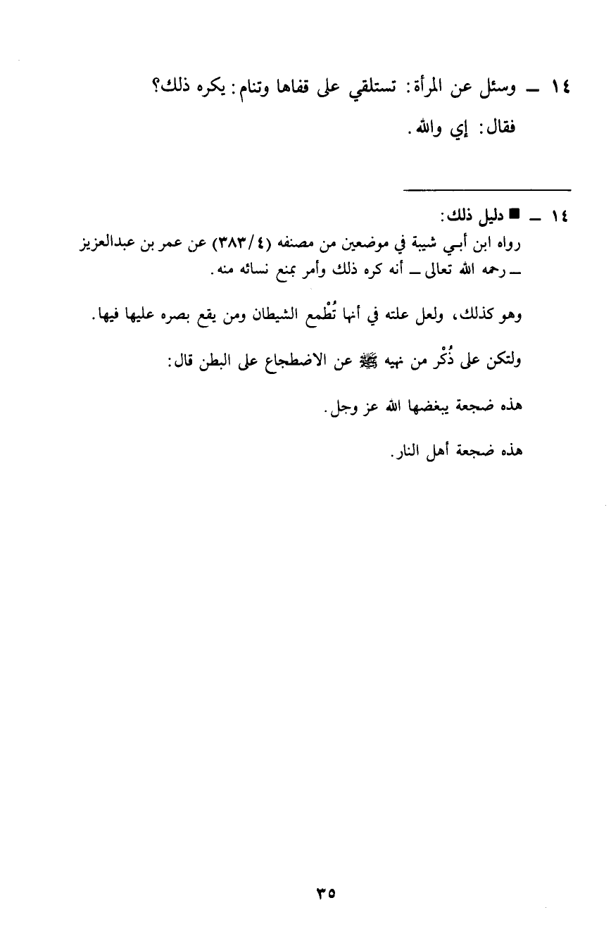 14 - وَسُئِلَ عَن الْمَرْأَة: تستلقي على قفاها وتنام: يكره ذَلِك؟