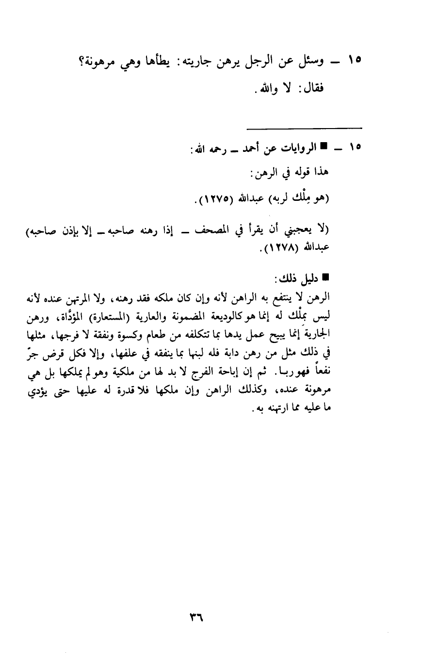 15 - وَسُئِلَ عَن الرجل يرْهن جَارِيَته: يَطَأهَا وَهِي مَرْهُونَة؟
