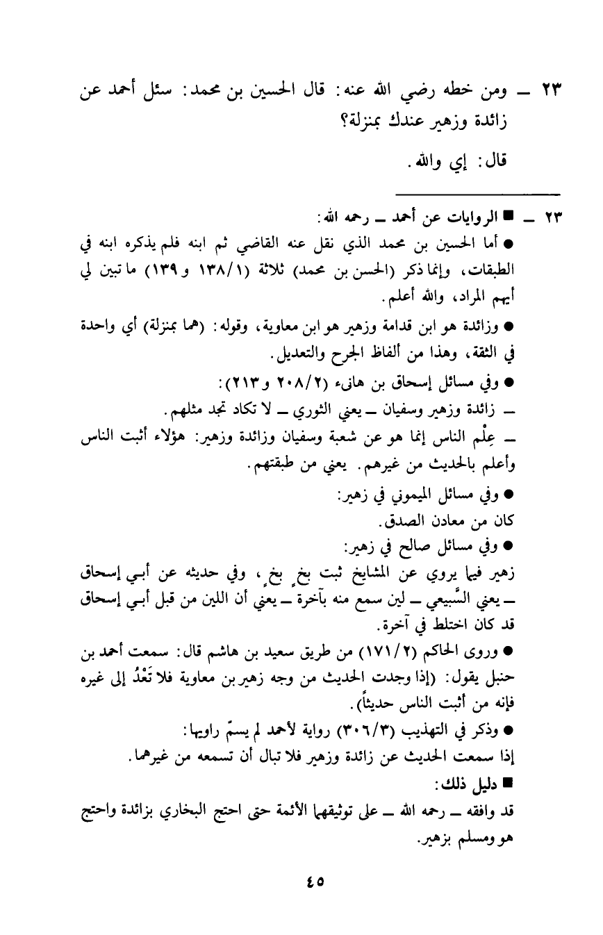 23 - وَمن خطة رَضِي الله عَنهُ: قَالَ الْحُسَيْن بن مُحَمَّد: سُئِلَ أَحْمد عَن زَائِدَة وَزُهَيْر عنْدك بِمَنْزِلَة؟