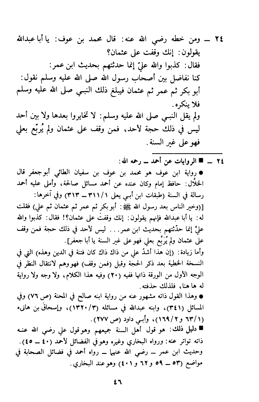 24 - وَمن خطه رَضِي الله عَنهُ: قَالَ مُحَمَّد بن عَوْف: يَا أَبَا عبد الله يَقُولُونَ: إِنَّك وقفت على عُثْمَان؟