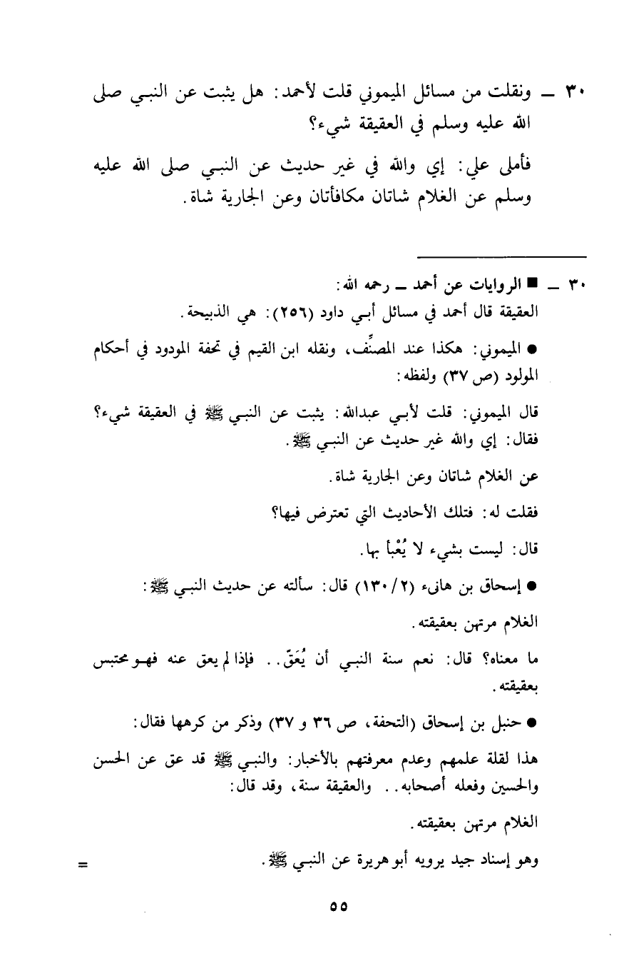 30 - ونقلت من مسَائِل الْمَيْمُونِيّ قلت لِأَحْمَد: هَل يثبت عَن النَّبِي صلى الله عَلَيْهِ وَسلم فِي الْعَقِيقَة شَيْء؟