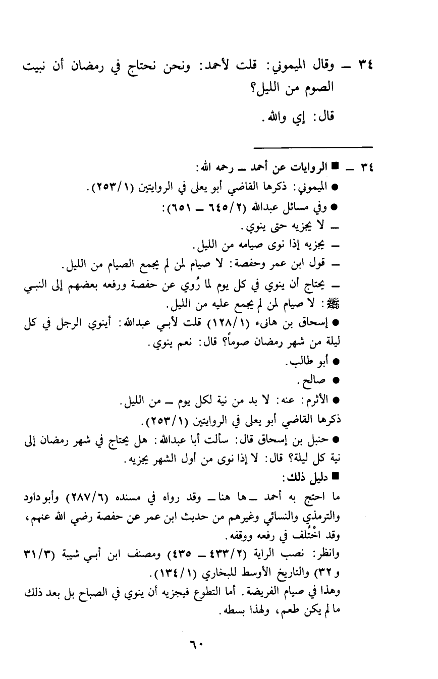 34 - وَقَالَ الْمَيْمُونِيّ: قلت لِأَحْمَد: وَنحن نحتاج فِي رَمَضَان أَن نبيت الصَّوْم من اللَّيْل؟