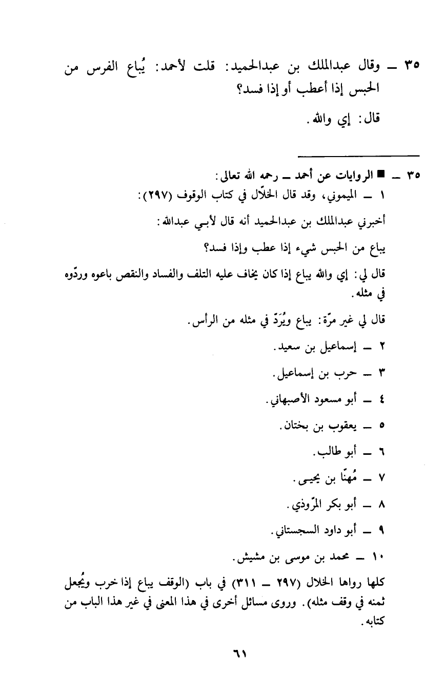 35 - وَقَالَ عبد الْملك بن عبد الحميد: قلت لِأَحْمَد: يُبَاع الْفرس من الْحَبْس إِذا أعطب أَو إِذا فسد؟