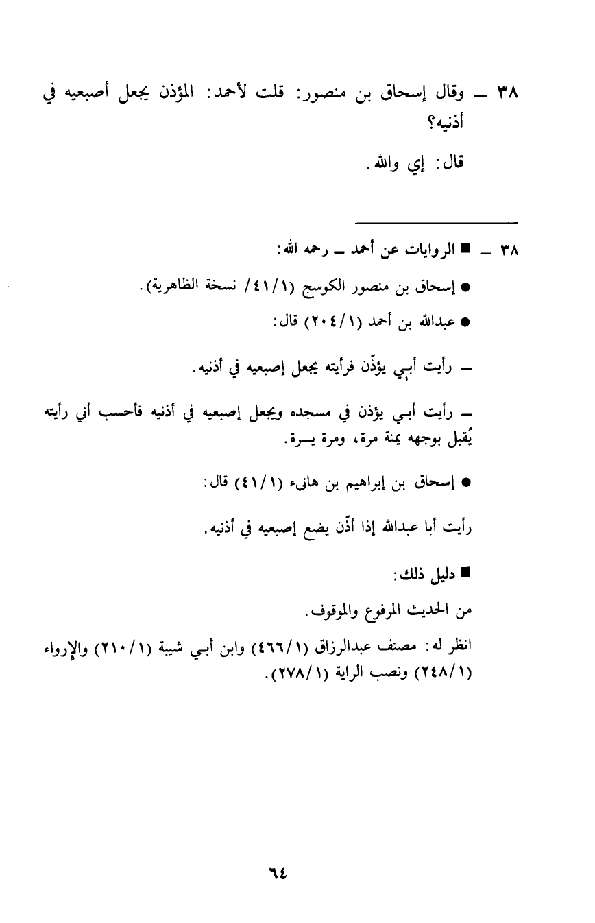 38 - وَقَالَ إِسْحَاق بن مَنْصُور: قلت لِأَحْمَد: الْمُؤَذّن يَجْعَل أصبعيه فِي أُذُنَيْهِ؟