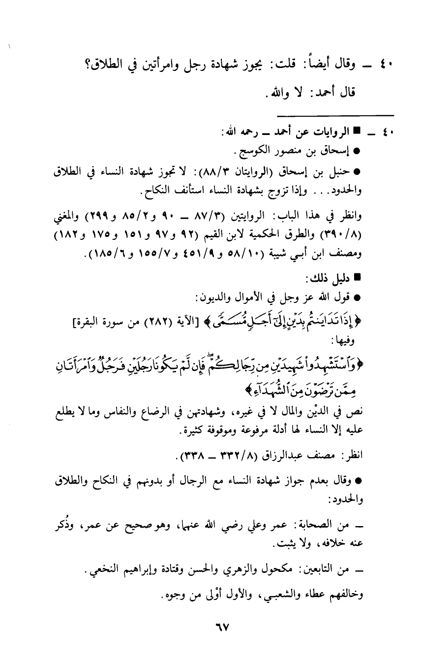 40 - وَقَالَ أَيْضا: قلت: يجوز شَهَادَة رجل وَامْرَأَتَيْنِ فِي الطَّلَاق؟