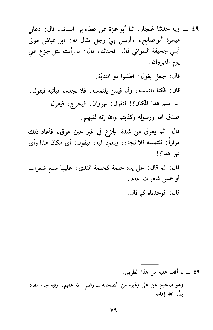 49 - وَبِه حَدثنَا غُنْجَار، ثَنَا أَبُو حَمْزَة عَن عَطاء بن السَّائِب قَالَ: دَعَاني ميسرَة أَبُو صَالح، وَأرْسل إِلَيّ رجل يُقَال لَهُ: ابْن عَيَّاش مولى أبي جُحَيْفَة السوَائِي قَالَ: فحدثنا، قَالَ: مَا رَأَيْت مثل جزع عَليّ يَوْم النهروان.