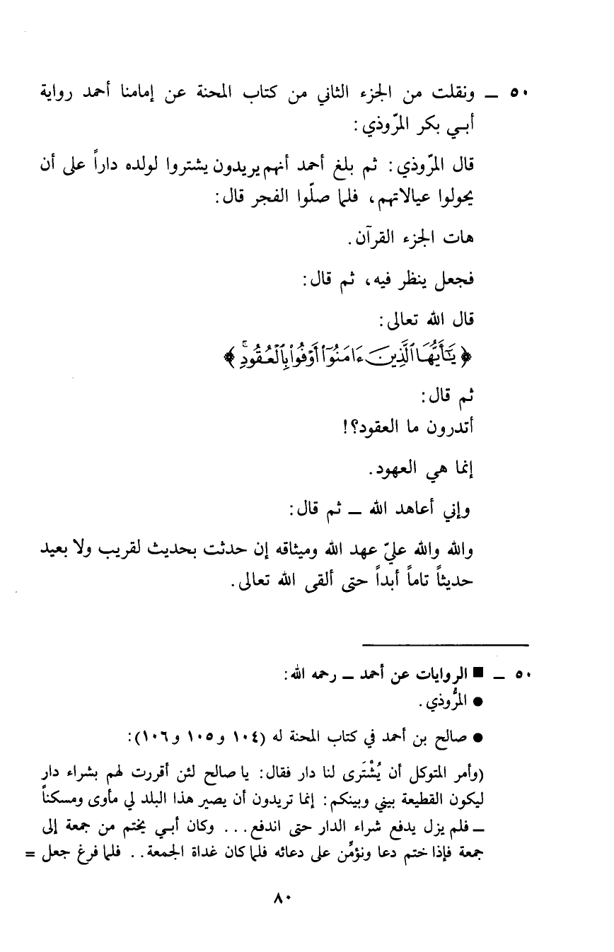 50 - ونقلت من الْجُزْء الثَّانِي من كتاب المحنة عَن إمامنا أَحْمد رِوَايَة أبي بكر الْمَرْوذِيّ: