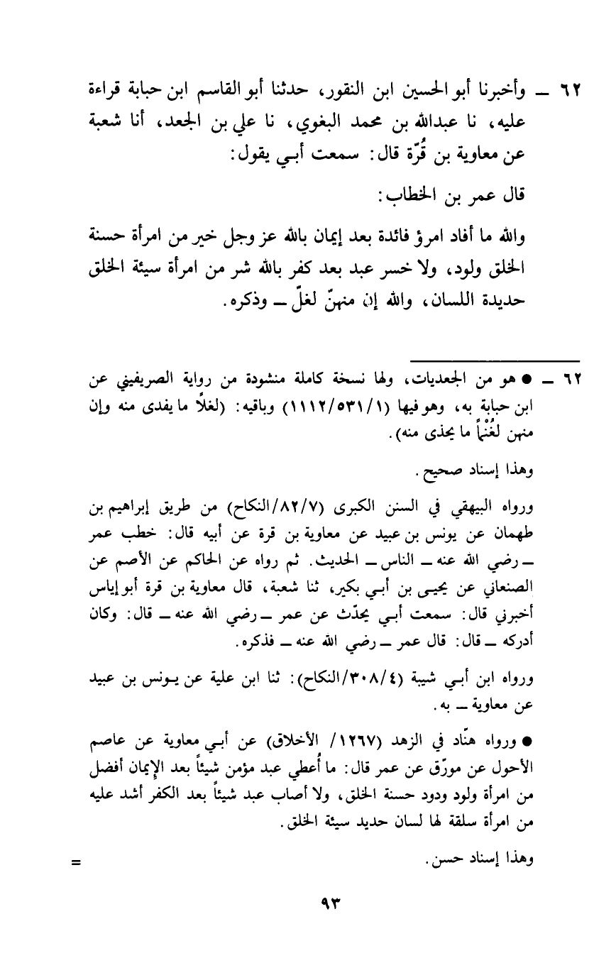 قَالَ عمر بن الْخطاب: وَالله مَا أَفَادَ امْرُؤ فَائِدَة بعد إِيمَان بِاللَّه عز وَجل خير من امْرَأَة حَسَنَة الْخلق ولود، وَلَا خسر عبد بعد كفر بِاللَّه شَرّ من امْرَأَة سَيِّئَة الْخلق حَدِيدَة اللِّسَان، وَالله إِن مِنْهُنَّ لغل - وَذكره