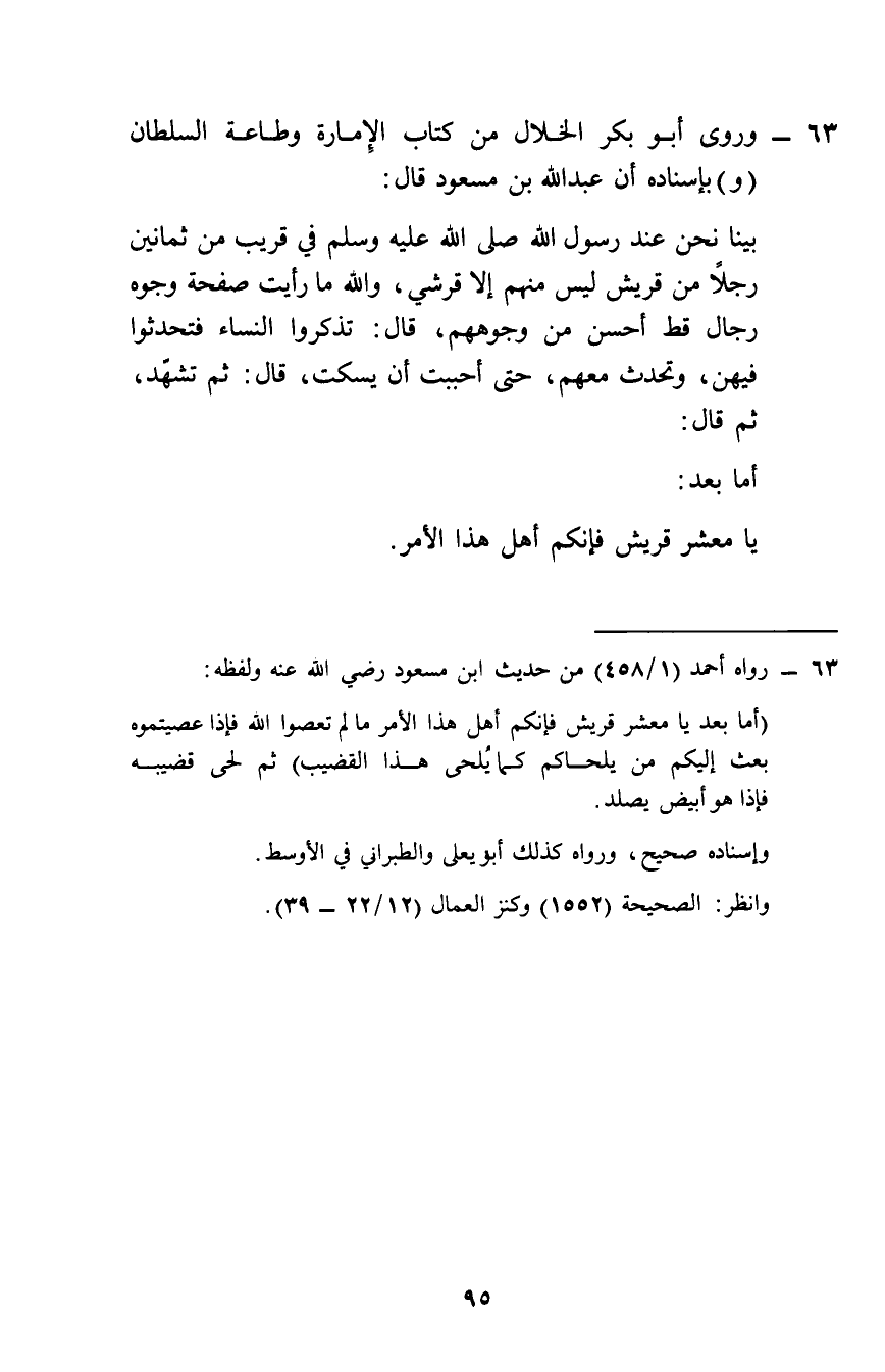 63 - وروى أَبُو بكر الْخلال من كتاب الْإِمَارَة وَطَاعَة السُّلْطَان (و) بِإِسْنَادِهِ أَن عبد الله بن مَسْعُود قَالَ:
