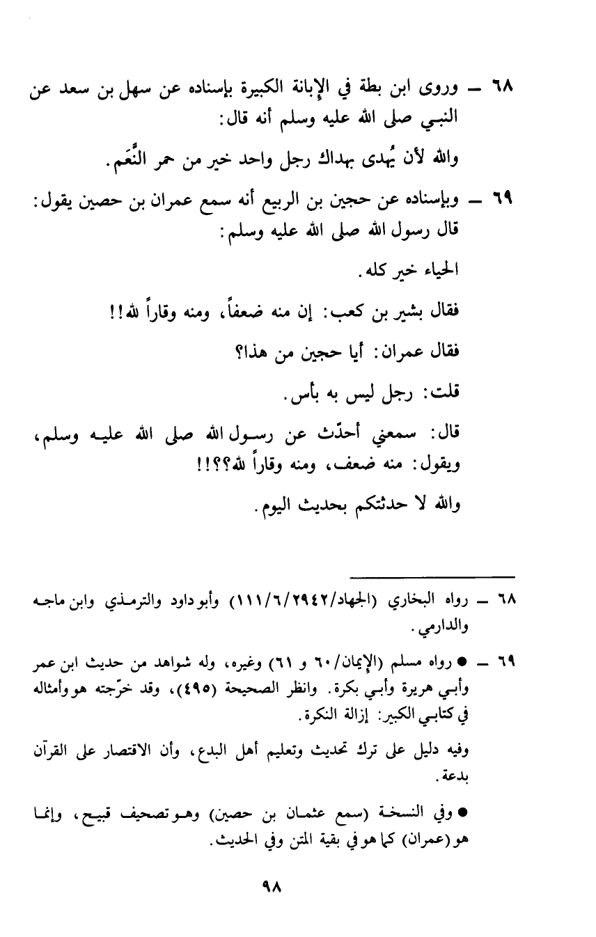 69 - وبإسناده عَن حجين بن الرّبيع أَنه سمع عمرَان بن حُصَيْن يَقُول: قَالَ رَسُول الله صلى الله عَلَيْهِ وَسلم: الْحيَاء خير كُله.