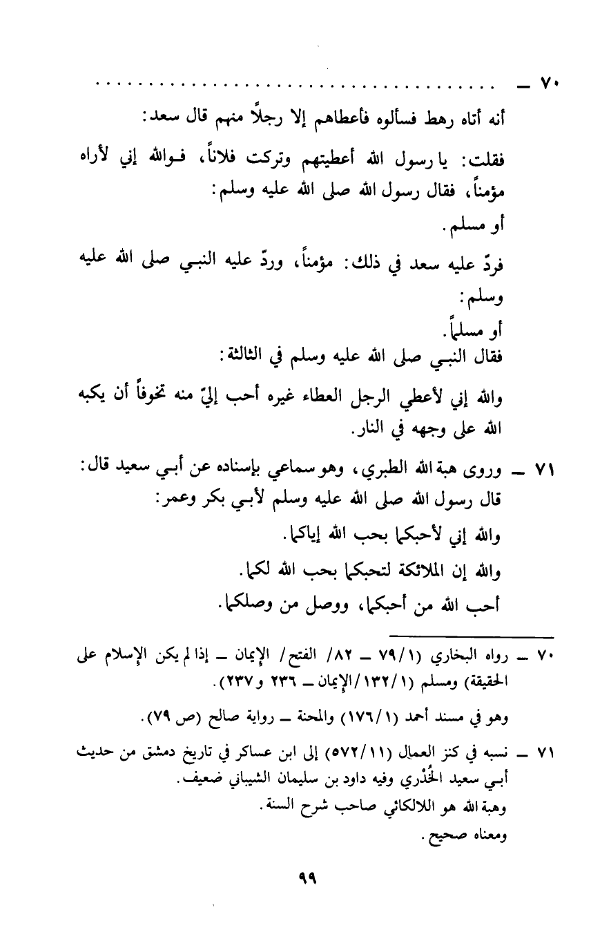 فَرد عَلَيْهِ سعد فِي ذَلِك: مُؤمنا، ورد عَلَيْهِ النَّبِي صلى الله عَلَيْهِ وَسلم أَو مُسلما.