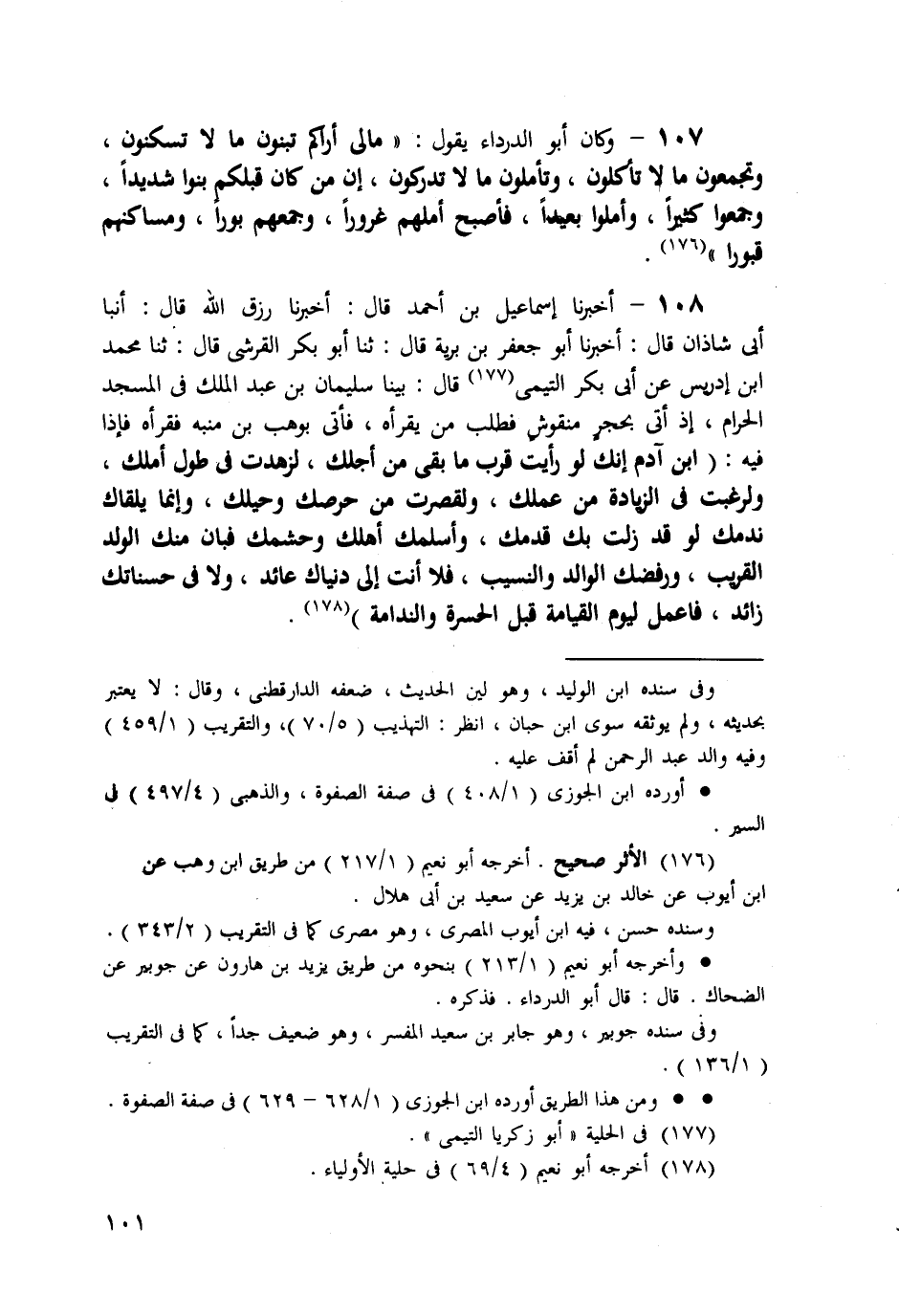 107- وكان أبو الدرداء يقول: ((مالي أراكم تبنون ما لا تسكنون، وتجمعون ما لا تأكلون، وتأملون ما لا تدركون، إن من كان قبلكم بنوا شديداً، وجمعوا كثيراً، وأملوا بعيداً، فأصبح أملهم غروراً وجمعهم بوراً، ومساكنهم قبوراً)) .