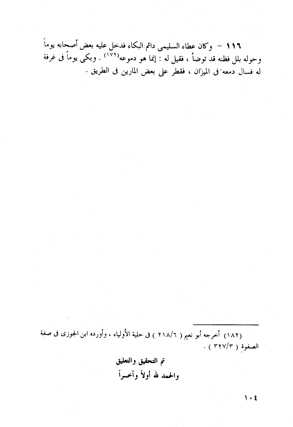 116- وكان عطاء السليمي دائم البكاء فدخل عليه بعض أصحابه يوماً وحوله بلل فظنه قد توضأ, فقيل له: إنما هو دموعه. وبكى يوماً في غرفة له فسال دمعه في الميزاب, فقطر على بعض المارين في الطريق.