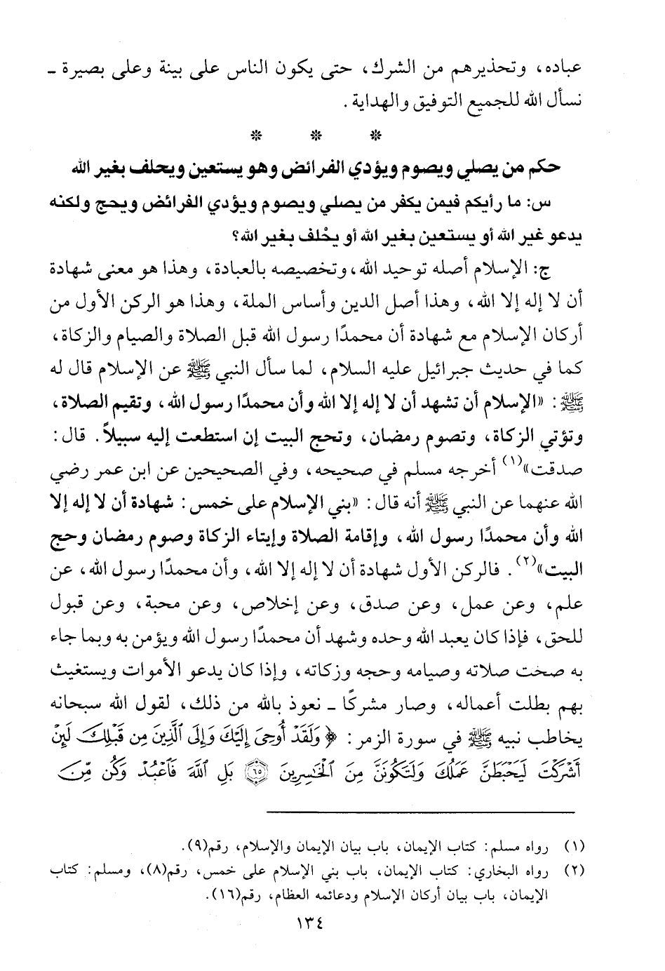 س63: يقول السائل: حدث حوار بيني وبين صديق لي عن الإسلام، حيث قال هذا الصديق: إنه لا يصلي على الإطلاق، فقلت له: أنت كافر؛ لأن الله تعالى يقول: {أَفَتُؤْمِنُونَ بِبَعْضِ الْكِتَابِ وَتَكْفُرُونَ بِبَعْضٍ فَمَا جَزَاءُ مَنْ يَفْعَلُ ذَلِكَ مِنْكُمْ إِلَّا خِزْيٌ فِي الْحَيَاةِ الدُّنْيَا وَيَوْمَ الْقِيَامَةِ يُرَدُّونَ إِلَى أَشَدِّ الْعَذَابِ} (1) وقال لي: أنت أيضا كذلك وذكر لي قول النبي صلى الله عليه وسلم: «من كفر مسلما فقد كفر» (2) وبعد ذلك تركته وذهبت حتي لا يحتدم النقاش إلى أكثر مما وصل إليه. فما حكم كلامنا هذا الذي تم بيننا؟ وهل نأثم عليه؟