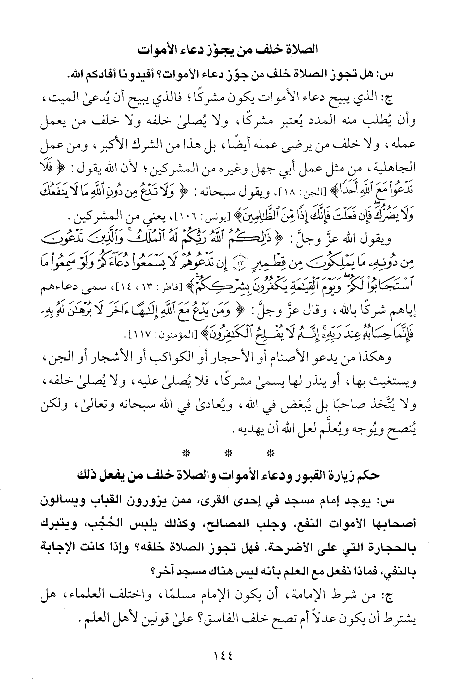 ومن هذا يعلم كل ذي بصيرة أن ما يفعله الناس عند قبر البدوي، أو عند قبر الحسين، أو عند قبر موسى كاظم، أو عند قبر الشيخ عبد القادر الجيلاني، أو ما أشبه ذلك، من طلب المدد والغوث أنه من الكفر بالله، ومن الشرك بالله سبحانه وتعالى، فيجب الحذر من ذلك، والتوبة من ذلك، والتواصي بترك ذلك. ولا يصلى خلف هؤلاء لأنهم مشركون، وعملهم هذا شرك أكبر، فلا يصلى خلفهم، ولا يصلى على ميتهم؛ لأنهم عملوا الشرك الأكبر الذي كانت عليه الجاهلية في عهد النبي صلى الله عليه وسلم، كأبي جهل وأشباهه من كفار مكة، وعليه كفار العرب؛ وهو دعاء الأموات والاستغاثة بهم أو بالأشجار والأحجار وهذا هو عين الشرك بالله عز وجل، والله سبحانه يقول: {وَلَوْ أَشْرَكُوا لَحَبِطَ عَنْهُمْ مَا كَانُوا يَعْمَلُونَ} (1) [الأنعام: 88] .