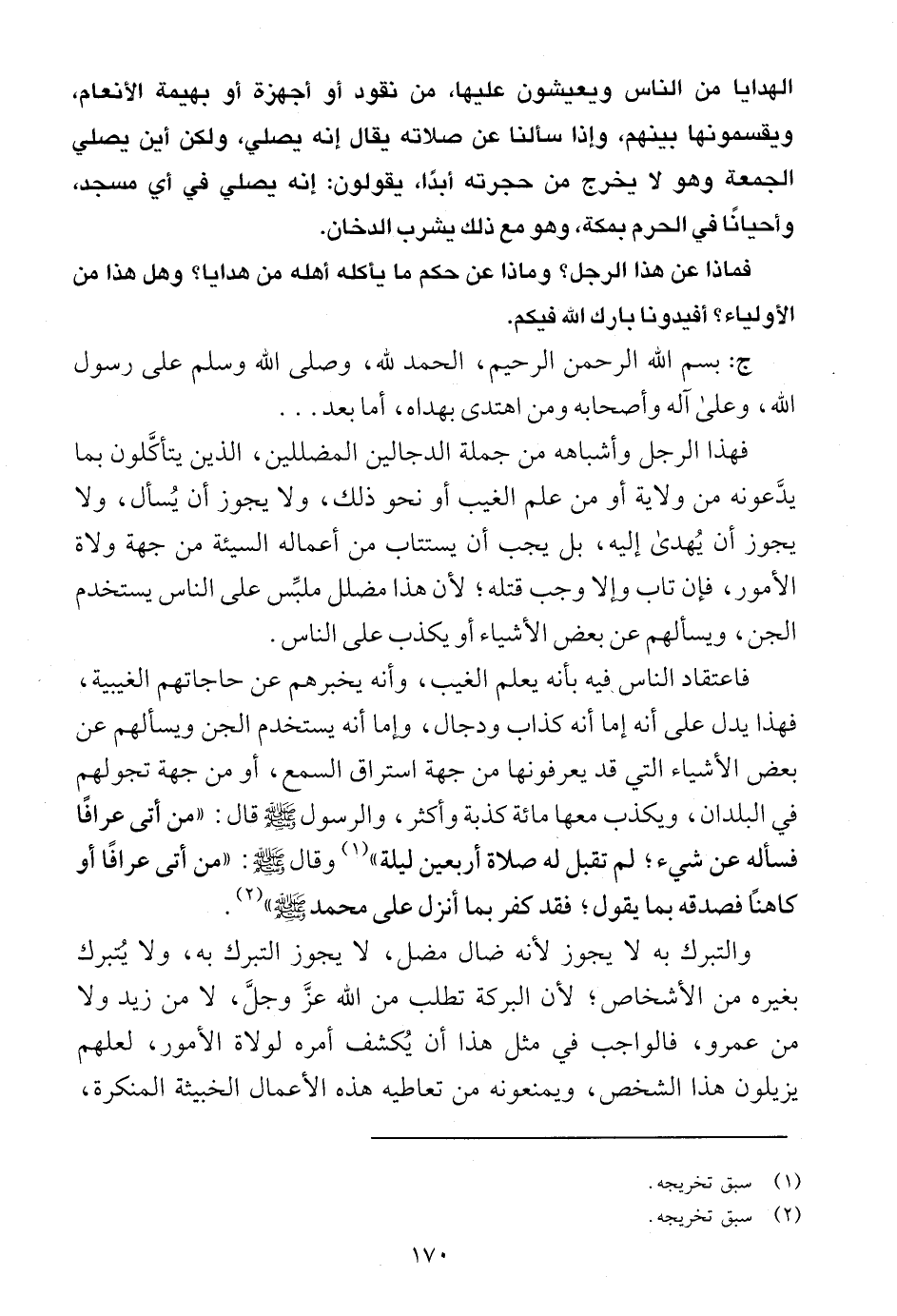 وهكذا يقول سبحانه: {وَمَنْ يَدْعُ مَعَ اللَّهِ إِلَهًا آخَرَ لَا بُرْهَانَ لَهُ بِهِ فَإِنَّمَا حِسَابُهُ عِنْدَ رَبِّهِ إِنَّهُ لَا يُفْلِحُ الْكَافِرُونَ} (4) [المؤمنون: 117] ، فسمى دعاء غير الله كفرا وشركا، فيجب التنبه لهذا الأمر الذي وقع فيه كثير من العامة والجهلة، ويجب على أهل العلم وعلى طلبة العلم أن ينصحوا لله ولعباده، ويعلموا هؤلاء الجهال حتى لا يستهينوا بدعوة القبور وأهلها، وحتى يدعوا الله وحده، ويستغيثوا به في حاجاتهم.