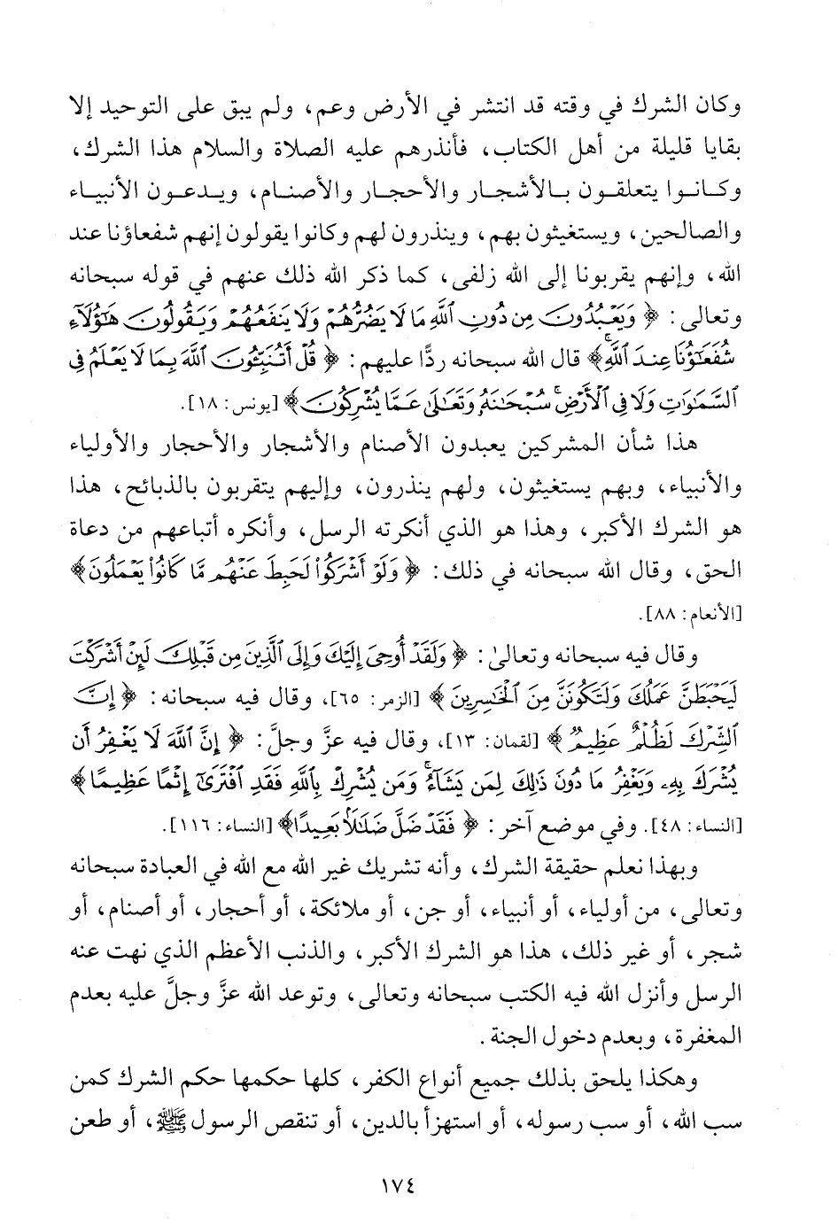 فإذا كان يدعو الأموات، ويستغيث بهم، وينذر لهم، ويقول المدد المدد يا سيدي فلان، أو يا سيدي فلان، أو يطلب من الرسول صلى الله عليه وسلم بعد وفاته أو من المرغني، أو من الحسين، أو من البدوي، أو من الشيخ عبد القادر، أو من غيرهم، فإن هذا يكون شركا أكبر؛ لأن الله سبحانه يقول: {فَلَا تَدْعُوا مَعَ اللَّهِ أَحَدًا} (4) الجن: 18، ويقول سبحانه وتعالى: {وَلَا تَدْعُ مِنْ دُونِ اللَّهِ مَا لَا يَنْفَعُكَ وَلَا يَضُرُّكَ فَإِنْ فَعَلْتَ فَإِنَّكَ إِذًا مِنَ الظَّالِمِينَ} (5) [يونس: 106] ، يعني المشركين، ويقول سبحانه وتعالى: {ذَلِكُمُ اللَّهُ رَبُّكُمْ لَهُ الْمُلْكُ وَالَّذِينَ تَدْعُونَ مِنْ دُونِهِ مَا يَمْلِكُونَ مِنْ قِطْمِيرٍ} (6) {إِنْ تَدْعُوهُمْ لَا يَسْمَعُوا دُعَاءَكُمْ وَلَوْ سَمِعُوا مَا اسْتَجَابُوا لَكُمْ وَيَوْمَ الْقِيَامَةِ يَكْفُرُونَ بِشِرْكِكُمْ} (7) [فاطر: 13، 14] ، سمى دعاءهم إياهم شركا بالله سبحانه وتعالى، وقال سبحانه: {وَمَنْ يَدْعُ مَعَ اللَّهِ إِلَهًا آخَرَ لَا بُرْهَانَ لَهُ بِهِ فَإِنَّمَا حِسَابُهُ عِنْدَ رَبِّهِ إِنَّهُ لَا يُفْلِحُ الْكَافِرُونَ} (8) [المؤمنون: 117] .