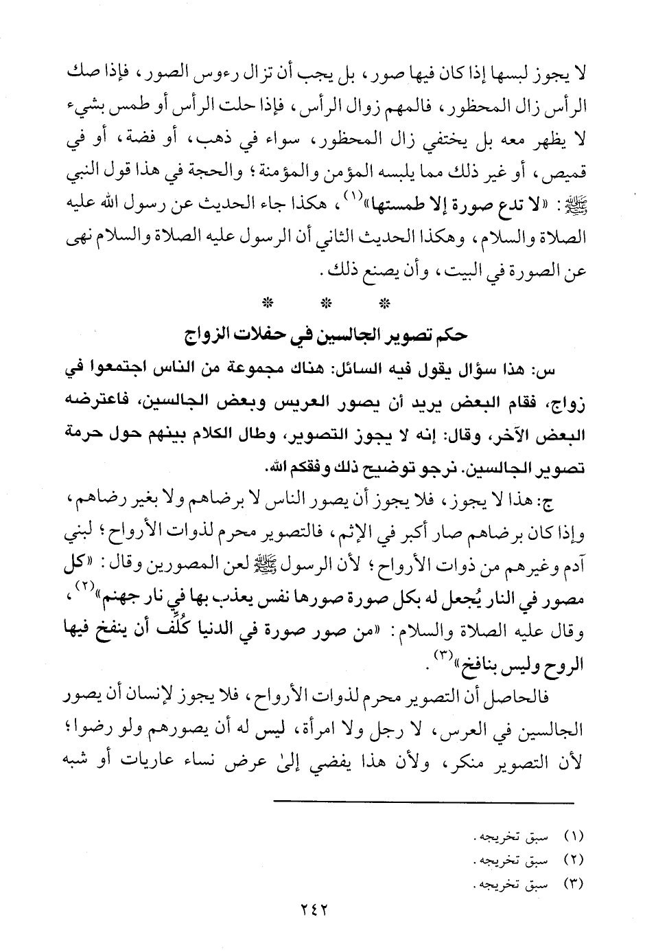 س108: يقول السائل: هناك من يقول تكره زيارة القبور للنساء لحديث أم عطية، وإن علم وقوع محرم منهن حرمت، وعليه يحمل قوله صلى الله عليه وسلم: «لعن الله زوارات القبور» (1) إلا لغير النبي صلى الله عليه وسلم وقبري صاحبيه رضي الله عنهما فتسن زيارتها للرجال والنساء، لعموم الأدلة في طلب زيارته صلى الله عليه وسلم فما هذه الأدلة؟ وما رأي سماحتكم في المسألة عامة. . . وفقكم الله؟