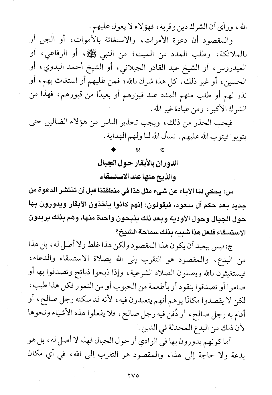أما الزيارة البدعية فهي زيارة القبور، للصلاة عندها، أو القراءة عندها، أو الدعاء عندها، فهذه الزيارة من البدع لقول النبي صلى الله عليه وسلم: «من عمل عملا ليس عليه أمرنا فهو رد» (3) أما إن دعا أصحاب القبور، أو استغاث بهم، أو طلب منهم الشفاعة، فهذا هو الشرك الأكبر الذي كان يفعله المشركون حول القبور.