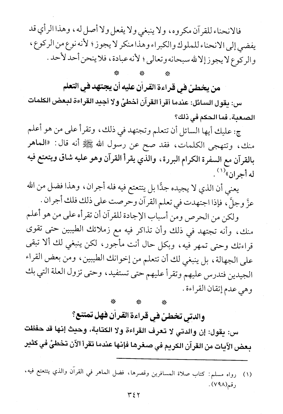 لكن لما وسع الوليد بن عبد الملك المسجد في عهده أدخل الحجرة في المسجد اجتهادا منه، وقد غلط، ولو تركها على حالها لكان أسلم وأبعد عن الشبهة، فإن بعض الناس اغتروا بهذا، وظنوا أن اتخاذ المساجد على القبور أمر مطلوب، وهذا غلط، فالنبي صلى الله عليه وسلم دفن في بيت عائشة رضي الله عنها وليس في المسجد، وهكذا صاحباه دفنا معه في البيت، ثم أدخلت الحجرة برمتها في المسجد، فلا يجوز لأحد أن يغتر بهذا، فالرسول صلى الله عليه وسلم حذر من هذا عليه الصلاة والسلام، وأبدأ وأعاد في ذلك، فيجب الحذر مما نهى عنه الرسول صلى الله عليه وسلم وألا يدفن إنسان في مسجد، وألا يقام مسجد على قبر لأن الرسول لعن من فعل ذلك، فيجب الحذر، ولأنه وسيلة للشرك.