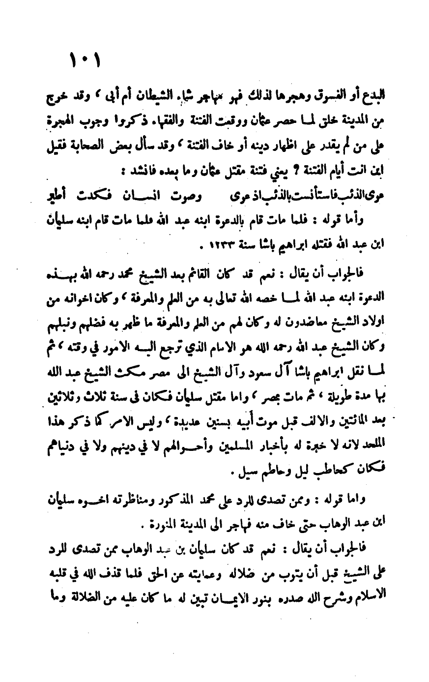 فالجواب أن يقال: نعم قد كان القائم بعد الشيخ محمد رحمه الله بهذه الدعوة ابنه عبد الله لما خصه الله تعالى به من العلم والمعرفة, وكان اخوانه من أولاد معاضدون له وكان لهم من العلم والمعرفة ما ظهر به فضلهم ونبلهم وكان الشيخ عبد الله –رحمه الله- هو الإمام الذي ترجع له الأمور في وقته، ثم لما نقل إبراهيم باشا آل سعود وآل الشيخ إلى مصر مكث الشيخ عبد الله بها مدة طويلة، ثم مات بمصر، وأما مقتل سليمان فكان في سنة ثلاث وثلاثين بعد المائتين والألف قبل موته أبيه بسنين عديدة، وليس الأمر كما ذكر هذا الملحد لأنه لا خبرة له بأخبار المسلمين وأحوالهم لا في دينهم ولا في دنياهم، وكان كحاطب ليل وحاطن سي.