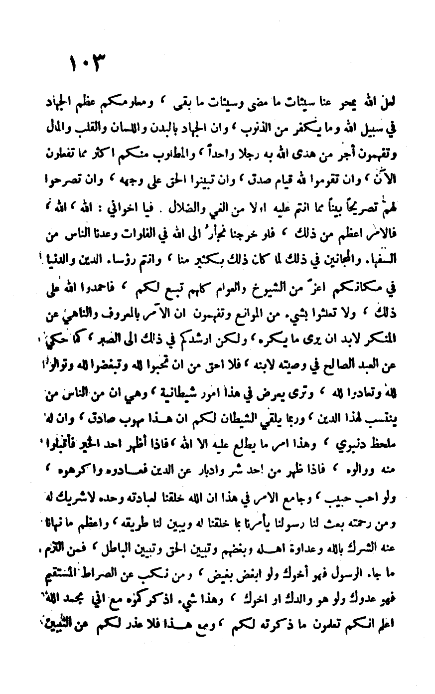 لعل الله أن يمحو عنا سيئات ما مضى وسيئات ما بقي ومعلومكم عظم الجهاد في سبيل الله وما يكفر من الذنوب، وأن الجهاد بالبدن واللسان والقلب والمال وتفهمون أجر من هدى الله به رجلاً واحداً، والمطلوب منكم أكثر مما تفعلون الآن، وأن تقوموا لله قيام صدق، وأن تبينوا الحق على وجهه، وأن تصرحوا لهم تصريحاً بيناً مما أنتم عليه أولاً من الغي والضلال. فيا إخواني: الله، الله، فالأمر أعظم من ذلك، فلو خرجنا نجأر إلى الله في الفلوات وعدنا الناس من السفهاء والمجانين في ذلك لما كان ذلك بكثير منا، وأنتم رؤساء الدين والدنيا في مكانكم أعز من الشيوخ والعوام كلهم تبع لكم، فاحمدوا على ذلك، ولا تعلثوا بشيء من الموانع وتفهمون أن الآمر بالمعروف والناهي عن المنكر لا بد أن يرى ما يكره، ولكن أرشدكم في ذلكم إلى الصبر، كما حكى عن العبد الصالح في وصيته لابنه، فلا أحق من أن تحبوا لله وتبغضوا لله وتوالوا لله وتعادوا لله، وترى يعرض في هذا أمور شيطانية، وهي أن من الناس من ينتسب إلى هذا الدين، وربما يلقي الشيطان لكم أن هذا مهوب صادق وأن له ملحظ دنيوي، وهذا أمر ما يطلع عليه إلا الله، فإذا أظهر أحد الخير فاقبلوا منه ووالوه، فإذا ظهر من أحد شر وإدبار عن الدين فعادوه واكرهوه، ولو أحب حبيب، وجامع الأمر في هذا أن الله خلقنا لعبادته وحده لا شريك له ومن رحمته بعث لنا رسولنا يأمرنا بما خلقنا له ويبين لنا طريقه، وأعظم ما نهانا عنه الشرك بالله وعداوة أهله وبغضهم وتبيين الحق وتبيين الباطل، فمن التزم ما جاء الرسول فهو أخوك ولو أبغض بغيض، ومن نكب عن الصراط المستقيم فهو عدوك ولو هو والدك أو أخوك، وهذا شيء أذكركموه مع أني بحمد الله أعلم أنكم تعلمون ما ذكرته، ومع هذا فلا عذر لكم عن التبيين
