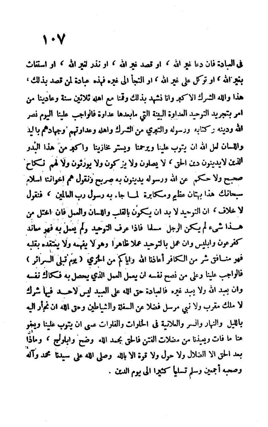 في العبادة فإن دعا غير الله، أو قصد غير الله، أو نذر لغير الله، أو استغاث بغير الله، أو توكل على غير الله، والتجأ إلى غيره فهذه عبادة لمن قصد بذلك هذا والله الشرك الأكبر وأنا نشهد بذلك وقمنا مع أهله ثلاثين سنة وعادينا من أمر بتجريد التوحيد العداوة البينة التي ما بعدها عداوة فالواجب علينا اليوم نصر الله ودينه وكتابه ورسوله والتبري من الشرك وأهله وعداوتهم وجهادهم باليد واللسان لعل الله أن يتوب علينا ويرحمنا ويستر مخازينا وأكبر من هذا البدو الذين لا يدينون دين الحق، لا يصلون ولا يزكون ولا يورثون ولا لهم نكاح صحيح ولا حكم عن الله ورسوله يدينون به صريح ونقول هم إخواننا إسلام سبحانك هذا بهتان عظيم ومكابرة لما جاء به رسول الله رب، فنقول لا خلاف، أن التوحيد لا بد أن يكون بالقلب واللسان والعمل فإن اختل من هذا شيء لم يكن الرجل مسلماً فإذا عرف التوحيد ولم يعمل به فهو معاند كفرعون وإبليس وإن عمل بالتوحيد عملاً ظاهراً وهو لا يفهمه ولا يعتقده بقلبه فهو منافق شر من الكافر أعاذنا الله وإياكم من الخزي {يَوْمَ تُبْلَى الْسَرَائِرُ} فالواجب علينا وعلى من نصح نفسه أن يعمل العمل الذي يحصل به فكاك نفسه وأنيعبد الله ولا يعبد غيره فالعبادة حق الله على العبيد ليس لأحد فيها شرك لا ملك مقرب ولا يعبد غيره فالعبادة حق الله على العبيد ليس لأحد فيها شرك لا ملك مقرب ولا نبي مرسل فضلاً عن السفلة والشياطين وحق الله أن نجأ إليه بالليل والنهار والسر والعلانية في الخلوات والفلوات عسى أن يتوب علينا ويعفو عنا ما فات ويعيذنا من مضلات الفتن فالحق بحمد الله وضح وابلولج، وماذا بعد الحق إلا الضلال ولا حول ولا قوة إلا بالله، وصلى الله على سيدنا محمد وآله وصحبه أجمعين وسلم تسليماً كثيراً إلى يوم الدين.