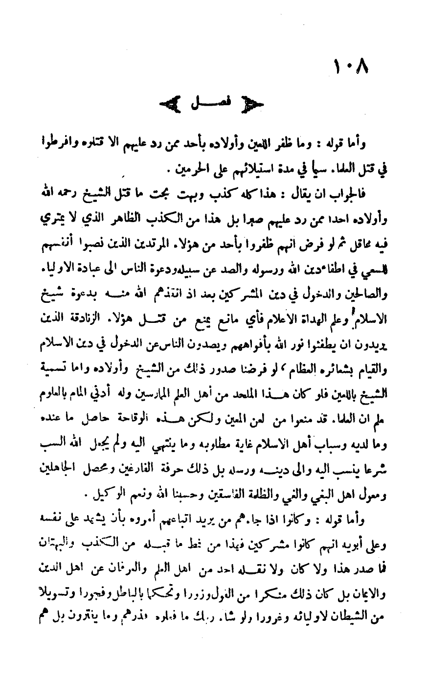 فالجواب أن يقال: هذا كله كذب وبهت بحت ما قتل الشيخ -رحمه الله- وأولاده أحداً ممن رد عليهم صبراً بل هذا من الكذب الظاهر الذي لا يمتري فيه عاقل ثم لو فرض أنهم ظفروا بأحد من هؤلاء المرتدين الذي نصبوا أنفسهم للسعي في إطفاء دين الله ورسوله والصد عن سبيله ودعوة الناس إلى عبادة الأولياء والصالحين والدخول في دين المشركين بعد إذ أنقذهم الله منه بدعوة شيخ الإسلام وعلم الهداة الأعلام فأي مانع يمنع من قتل هؤلاء الزنادقة الذين يريدون أن يطفئوا نور الله بأفواههم ويصدون الناس عن الدخول في دين الإسلام والقيام بشعائره العظام، لو فرضنا صدور ذلك من الشيخ وأولاده وأما تسمية الشيخ باللعين فلو كان هذا الملحد من أهل العلم الممارسين وله أدنى إلمام بالعلوم لعلم أن العلماء قد منعوا من لعن المعين ولكن هذه الوقاحة حاصل ما عنده وما لديه وسباب أهل الإسلام غاية مطلوبة وما ينتهي إليه ولم يجعل الله السب شرعاً ينسب غليه وإلى دينه ورسله، بل ذلك حرفة الفارغين ومحاصل الجاهلين ومعول أهل البغي والغي والظلمة الفاسقين وحسبنا الله ونعم الوكيل.