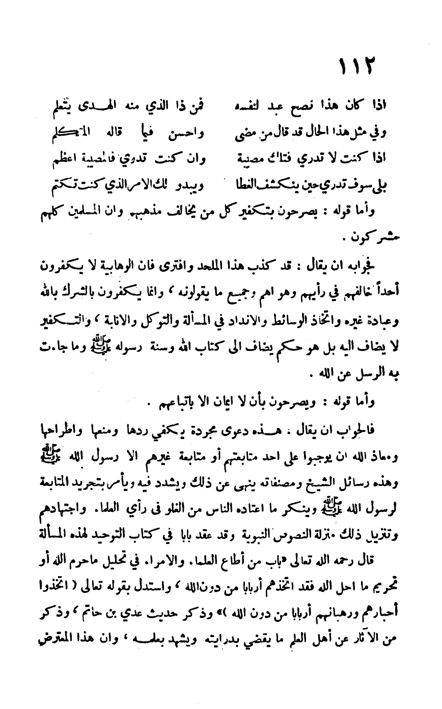 فالجواب أن يقال: هذه دعوى مجردة يكفي ردها ومنعها واطراحها ومعاذ الله أن يوجبوا على أحد متابعتهم أو متابعة غيرهم إلا رسول الله –صلى الله عليه وسلم- وهذه رسائل الشيخ ومصنفاته ينهى عن ذلك ويشدد فيه ويأمر بتجريد المتابعة لرسول الله –صلى الله عليه وسلم- وينكر ما اعتاده الناس من الغلو في رأي العلماء واجتهادهم وتنزيل ذلك منزلة النصوص النبوية وقد عقد باباً في كتاب التوحيد لهذه المسألة.