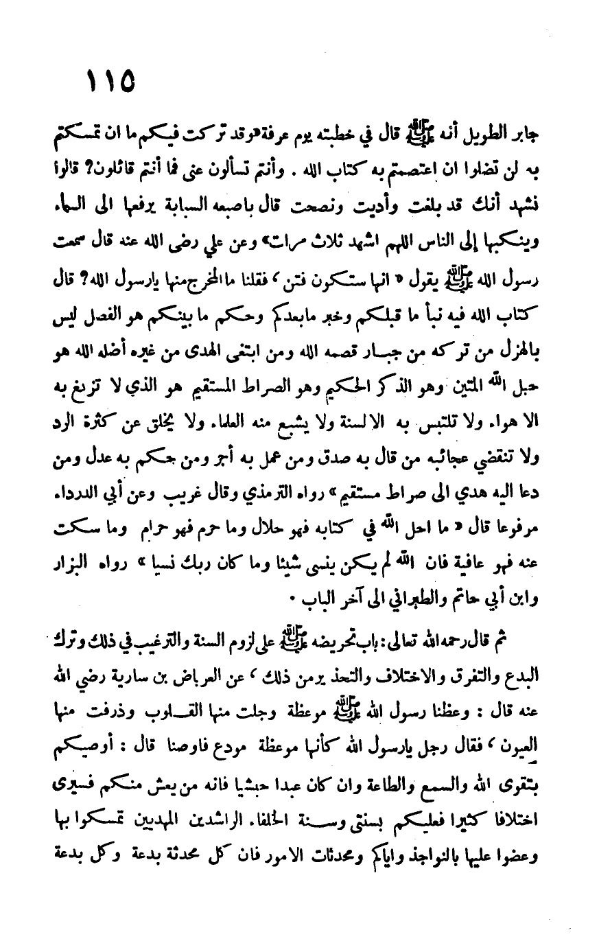 جابر الطويل أنه صلى الله عليه وسلم قال في خطبته يوم عرفة "وقد تركت فيكم ما أن تمسكتم به لن تضلوا إن اعتصمتم به كتاب الله". وأنتم تسألون عني فما أنتم قائلون؟ قالوا نشهد أنك قد بلغت وأديت ونصحت قال بأصبعه السبابة يرفعها إلى السماء وينكبها إلى الناس "اللهأصبعم اشهد ثلاث مراتب" وعن علي –رضي الله عنه- قال سمعت رسول الله –صلى الله عليه وسلم- يقول: "إنها ستكون فتن"، فقلنا ما المخرج منها يا رسول الله؟ قال: "كتاب الله فيه نبأ ما قبلكم وخبر ما بعدكم وحكم ما بينكم هو الفصل ليس بالهزل من تركه من جبار قصمه الله ومن ابتغى الهدى من غيره أضله الله هو حبل الله المتين وهو الذكر الحكيم وهو الصراط المستقيم هو الذي لا تزيغ به الأهواء ولا تلتبس به الألسنة ولا يشبع من العلماء ولا يخلق عن كثرة الرد ولا تنقضي عجائبه من قال به صدق ومن عمل به أجر ومن حكم به عدل ومن دعا إليه هدي إلى صراط مستقيم" رواه الترمذي وقال غريب وعن أبي الدرداء مرفوعاً قال: "ما أحل الله في كتابه فهو حلال حلا وما حرم فهو حرام وما سكت عنه فهو عافية فإن الله لم يكن ينسى شيئاً وما كان ربك نسياً" رواه البزار وابن أبي حاتم والطبراني إلى آخر الباب.