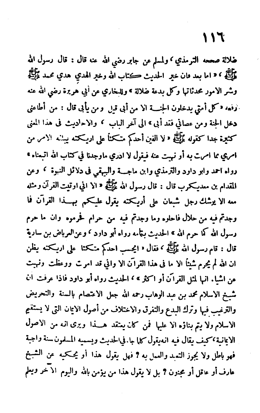 ضلالة" صححه الترمذي، ولمسلم عن جابر –رضي الله عنه- قال: قال رسول الله –صلى الله عليه وسلم-: "أما بعد فإن خير الحديث كتاب الله وخير الهدي هدي محمد –صلى الله عليه وسلم- وشر الأمور محدثاتها وكل بدعة ضلالة" وللبخاري عن أبي هريرة –رضي الله عنه- رفعه: "كل أمتي يدخلون الجنة إلا من أبى" قيل ومن يأبى قال: "من أطاعني دخل الجنة ومن عصاني فقد أبى" إلى آخر الباب، والأحاديث في هذا المعنى كثيرة جداً كقوله –صلى الله عليه وسلم-: "لا ألفين أحدكم متكئاً على أريكته يبلغه الأمر من أمري مما أمرت به أو نهيتُ عنه فيقول لا أدري ما وجدنا في كتاب الله اتبعناه" رواه أحمد وأبو داود والترمذي وابن ماجه والبيهقي في "دلائل النبوة"، وعن المقدام بن معديكرب قال: قال رسول الله –صلى الله عليه وسلم-: "الا وإني أوتيت القرآن ومثله معه ألا يوشك رجل شبعان على أريكته يقول عليكم بهذا القرآن فما وجدتم فيه من حلال فأحلوه وما وجدتم فيه من حرام فحرموه وإن ما حرم رسول الله كما حرم الله" الحديث بتمامه رواه أبو داود، وعن العرباض بن سارية قال: قام رسول الله –صلى الله عليه وسلم- فقال: "أيحسب أحدكم متكئاً على أريكته يظن أن الله لم يحرم شيئاً إلا ما في هذا القرآن ألا وإني قد أمرت ووعظت ونهيت عن أشياء إنها لمثل القرآن أو أكثر" الحديث رواه أبو داود فإذا عرفت أن شيخ الإسلام محمد بن عبد الوهاب –رحمه الله- جعل الاعتصام بالسنة والتحريض والترغيب فيها وترك البدع والتفرق والاختلاف من أصول الإيمان التي لا يستقيم الإسلام ولا يتم بناؤه إلا عليها فمن كان يعتقد هذا ويرى أنه من الأصول الإيمانية، كيف يقال فيه إنه يقول كلما جاء في الحديث ويسميه المسلمون سنة واجبة فهو باطل ولا يجوز التعبد والعمل به؟ فهل يقول هذا أو يحكيه عن الشيخ عارف أو عاقل أو مجنون؟ بل لا يقول هذا من يؤمن بالله واليوم الآخر ويعلم