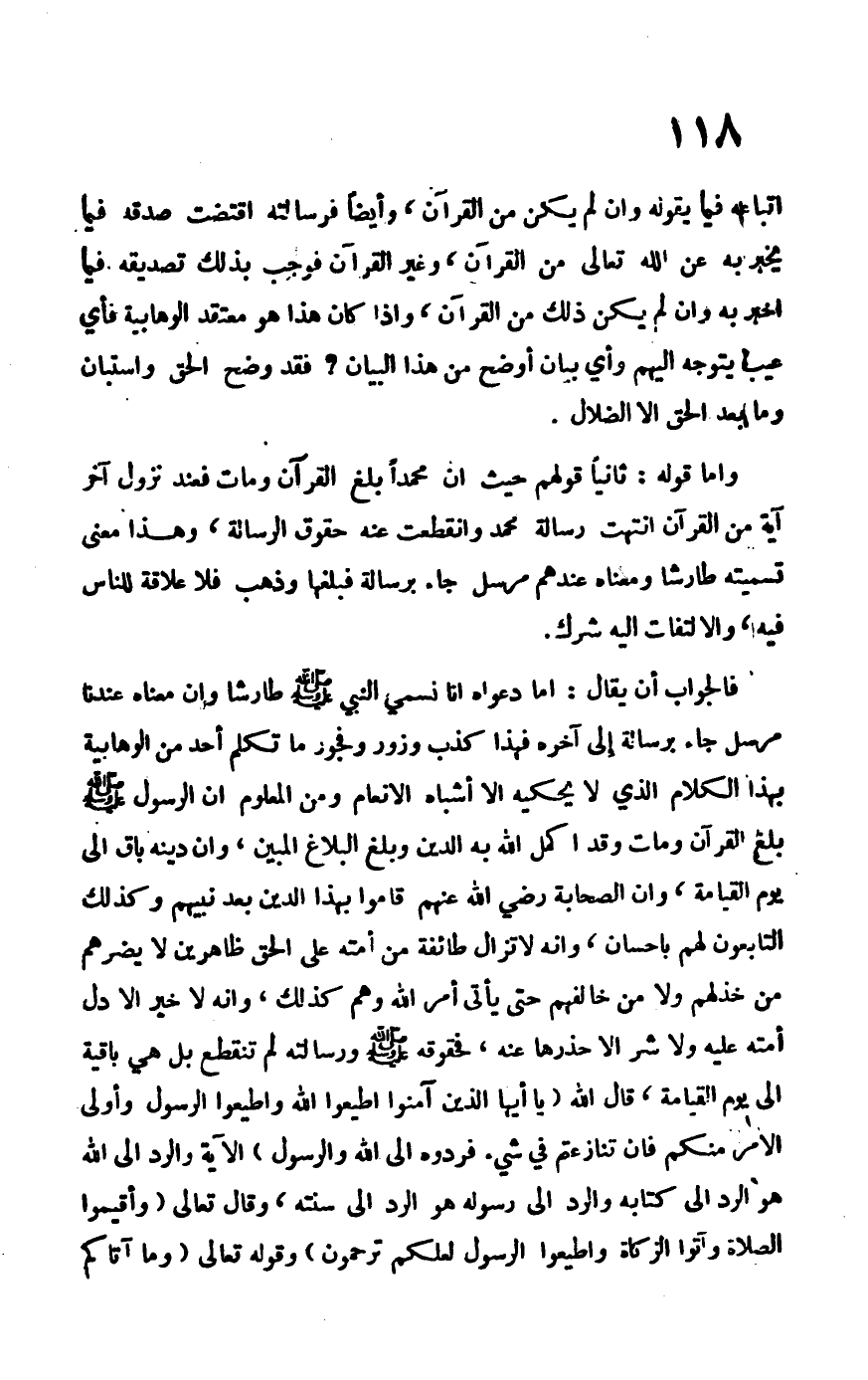 اتباعه فيما يقوله وإن لم يكن من القرآن، وأيضا فرسالته اقتضت صدقه فيما يخبر به عن الله تعالى من القرآن، وغير القرآن فوجب بذلك تصديقه فيما أخبر به وإن لم يكن ذلك من القرآن وإذا كان هذا هو معتقد الوهابية فأي عيب يوجه إليهم وأي بيان أوضح من هذا البيان؟ فقد وضح الحق واستبان وما بعد الحق إلا الضلال.