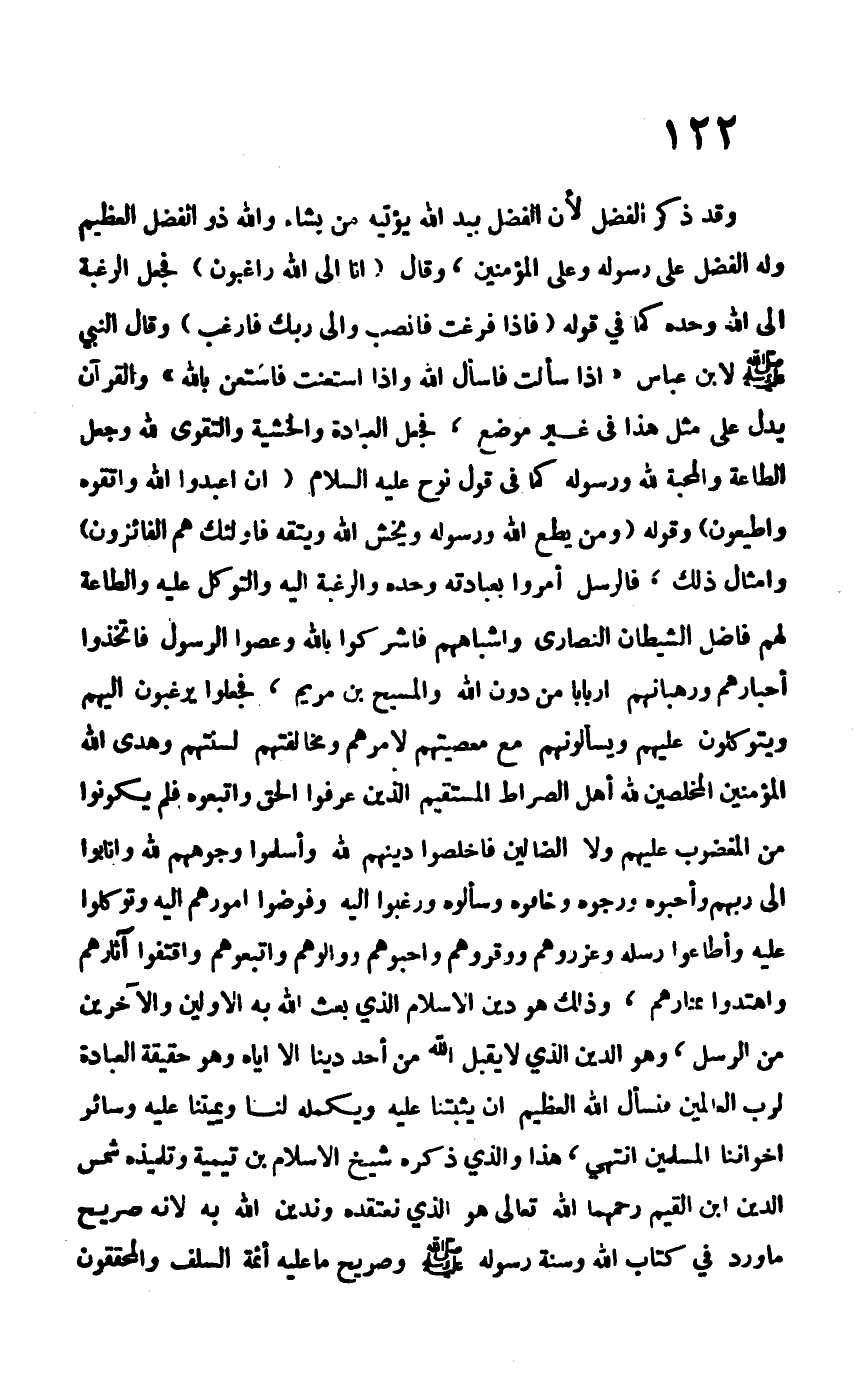 وقد ذكر الفضل لأن الفضل بيد الله يؤتيه من يشاء والله ذو الفضل العظيم وله الفضل على رسوله وعلى المؤمنين، وقال: {إ ِنَّا إِلَى اللَّهِ رَاغِبُونَ} فجعل الرغبة إلى الله وحده كما في قوله: {فَإِذَا فَرَغْتَ فَانْصَبْ , وَإِلَى رَبِّكَ فَارْغَبْ} وقال النبي –صلى الله عليه وسلم- لابن عباس: "إذا سألت فاسأل الله وإذا استعنت فاستعن بالله" والقرآن يدل على مثل هذا في غير موضع، فجعل العبادة والخشية والتقوى لله وجعل الطاعة والمحبة لله ورسوله كما في قول نوح –عليه السلام-: {أَنِ اعْبُدُوا اللَّهَ وَاتَّقُوهُ وَأَطِيعُونِ} وقوله: {وَمَنْ يُطِعِ اللَّهَ وَرَسُولَهُ وَيَخْشَ اللَّهَ وَيَتَّقْهِ فَأُولَئِكَ هُمُ الْفَائِزُونَ} وأمثال ذلاك، فالرسل أمروا بعبادته وحده والرغبة إليه والتوكل عليه والطاعة لهم فأضل الشيطان النصارى وأشباههم فأشركوا بالله وعصوا الرسول فاتخذوا أحبارهم ورهبانهم أرباباً من دون الله والمسيح ابن مريم، فجعلوا يرغبوا إليه ويتوكلون عليهم ويسألونهم مع معصيتهم لأمرهم ومخالفتهم لسنتهم وهدى الله المؤمنين المخلصين لله أهل الصراط المستقيم الذين عرفوا الحق واتبعواه فلم يكون من المغضوب عليهم ولا الضالين فأخلصوا دينهم لله وأسلموا وجوهم لله وأنابوا إلى ربهم وأحبوه ورجوه وخافوه وسألوه ورغبوا إليه وفوضا أمورهم إليه وتوكلوا عليه وأطاعوا رسله وعزروهم ووقروهم وأحبوهم ووالوهم واتبعوهم واقتفوا آثارهم واهتدوا بمنارهم، وذلك هو دين الإسلام الذي بعث الله به الأولين والآخرين من الرسل، وهو الدين الذي لا يقبل من أحد ديناً إلا إياه وهو حقيقة العبادة لرب العالمين فنسأل الله العظيم أن يثبتنا عليه ويكمله لنا ويميتنا عليه وسائر إخواننا المسملين. انتهى، هذا والذي ذكره شيخ الإسلام ابن تيمية وتلميذه شمس الدين ابن القيم –رحمهما الله تعالى- هو الذي نعتقده وندين الله به لأنه صريح ما ورد في كتاب الله وسنة رسوله –صلى الله عليه وسلم- وصريح ما عليه أئمة السلف والمحققون