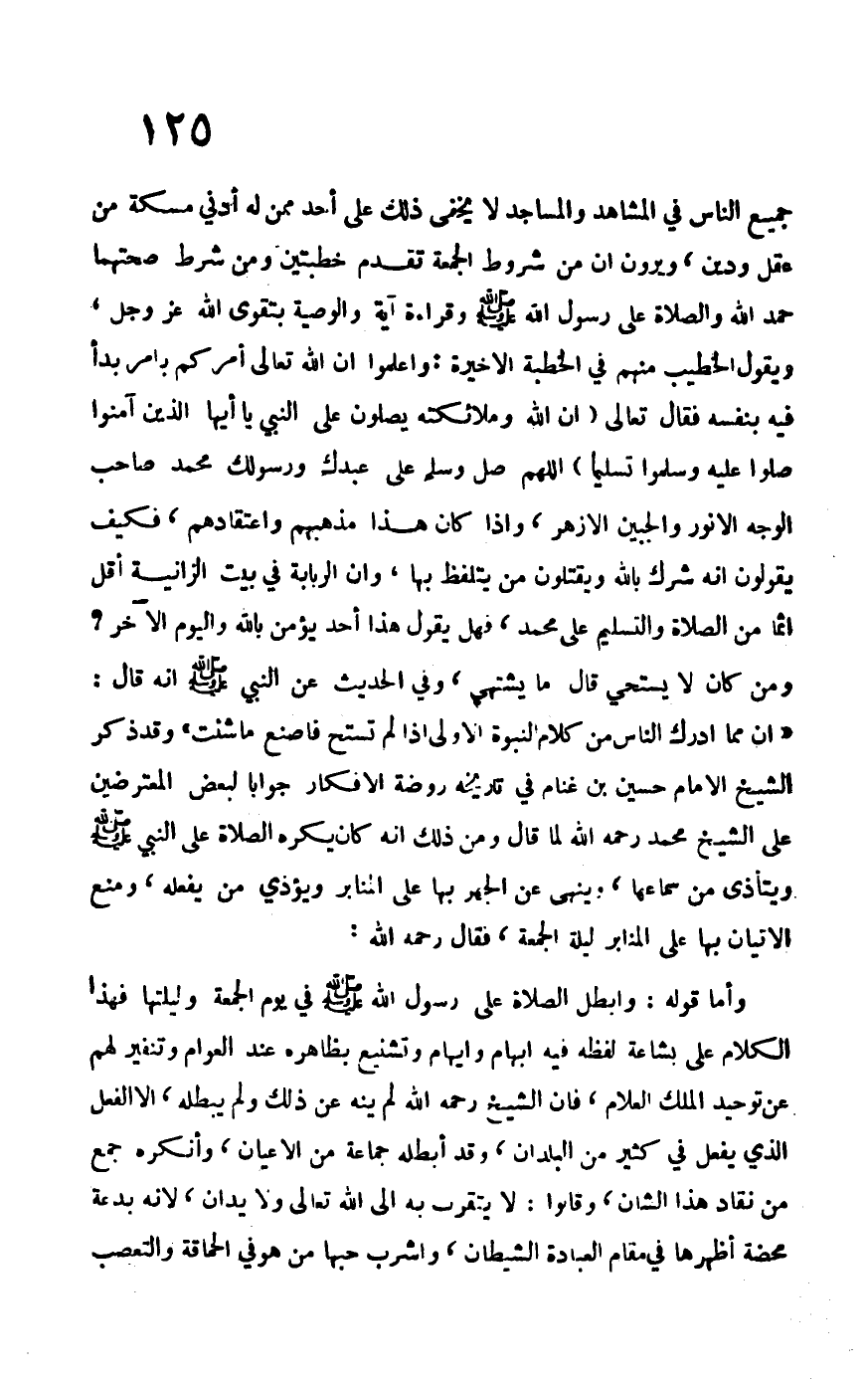 جميع الناس في المشاهد والمساجد لا يخفى ذلك على أحد ممن له أدنى مسكة من عقل ودين، ويرون أن من شروط الجمعة تقدم خطبتين ومن شرط صحتهما حمد الله والصلاة على رسول الله –صلى الله عليه وسلم- وقراءة آية والوصية بتقوى الله عز وجل، ويقول الخطيب منهم في الخطبة الأخيرة: واعلموا أن الله تعالى أمركم بأمر بدأ فيه بنفسه فقال تعالى: {إِنَّ اللَّهَ وَمَلائِكَتَهُ يُصَلُّونَ عَلَى النَّبِيِّ يَا أَيُّهَا الَّذِينَ آمَنُوا صَلُّوا عَلَيْهِ وَسَلِّمُوا تَسْلِيماً} اللهم صل وسلم على عبدك ورسولك محمد صاحب الوجه الأنور والجبين الأزهر، وإذا كان هذا مذهبهم واعتقادهم، فكيف يقولون إنه شرك بالله ويقتلون من يتلفظ بها، وأن الربابة في بيت الزانية أقل إثماً من الصلاة والتسليم على محمد، فهل يقول هذا أحد يؤمن بالله واليوم الآخر؟ ومن كان لا يستحي قال ما يشتهي، وفي الحديث عن النبي –صلى الله عليه وسلم- أنه قال: "إن مما أدرك الناس من كلام النبوة الأولى إذا لم تستح فاصنع ما شئت" وقد ذكر الشيخ الإمام حسين بن غنام في تاريخه روضة الأفكار جواباً لبعض المعترضين على الشيخ محمد –رحمه الله- لما قال ومن ذلك أنه كان يكره الصلاة على النبي –صلى الله عليه وسلم- ويتأذى من سماعها، وينهى عن الجهر بها على المنابر ويؤذي من يفعله، ومنه الإتيان بها على المنابر ليلة الجمعة، فقال -رحمه الله-: