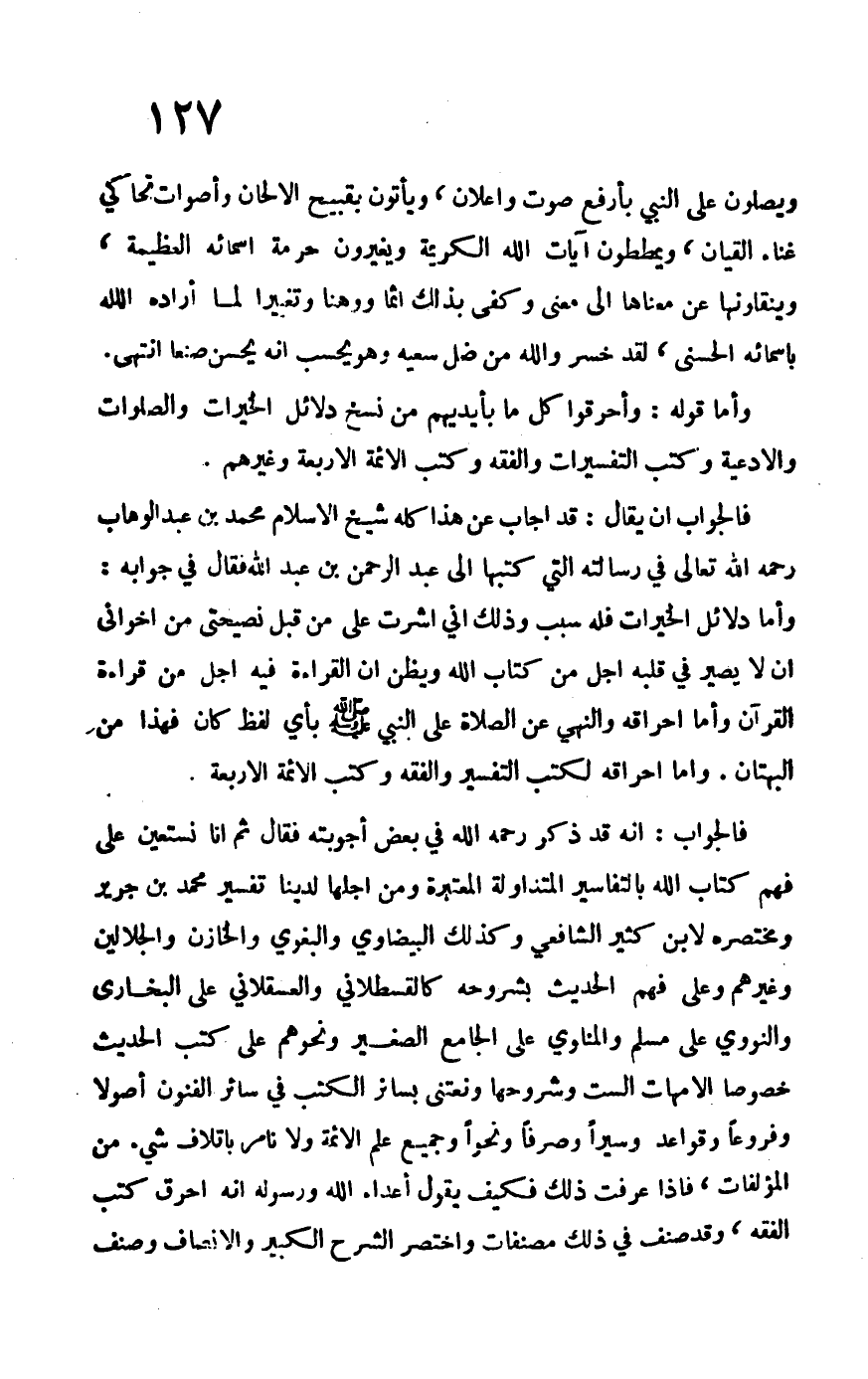 وأما قوله: وأحرقوا كل ما بأيديهم من نسخ دلائل الخيرات والصلوات والأدعية وكتب التفسيرات والفقه وكتب الأئمة الأربعة وغيرهم.