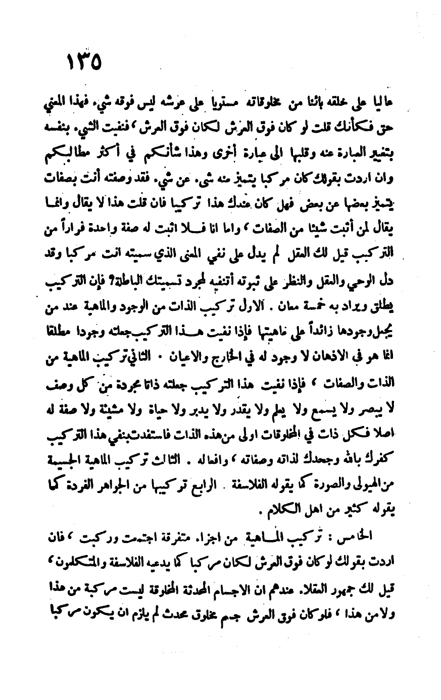 الخامس: تركيب الماهية من أجزاء متفرقة اجتمعت وركبت، فإن أردت بقولك لو كان فوق العرش لكان مركباً كما يدعيه الفلاسفة والمتكلمون، قيل لك جمهور العقلاء عندهم أن الأجسام المحدثة المخلوقة ليست مركبة من هذا ولا من هذا، فلو كان فوق العرش جسم مخلوق محدث لم يلزم أن يكون مركباً