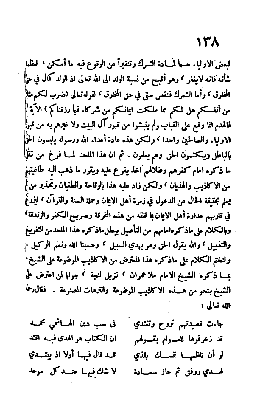 لبعض الأولياء حسماً لمادة الشرك وتنفيراً عن الوقوع فيه ما أمكن، لعظمة شأنه فإنه لا يغفر، وهو أقبح من نسبة الولد إلى الله تعالى إذ الولد كمال في حق المخلوق، وأما الشرك فنقص حتى في حق المخلوق، لقوله تعالى: {ضَرَبَ لَكُمْ مَثَلاً مِنْ أَنْفُسِكُمْ هَلْ لَكُمْ مِمَّا مَلَكَتْ أَيْمَانُكُمْ مِنْ شُرَكَاءَ فِيمَا رَزَقْنَاكُمْ} الآية فالهدم إنما وقع على القباب ولم ينبشوا من قبور آل البيت ولا غيرهم من قبور الأولياء والصالحين، واحداً، ولكن هذه عادة أعداء الله ورسوله يلبسون الحق بالباطل ويكتمون الحق وهم يعلمون. ثم إن هذا الملحد لما فرع من نقل ما ذكره إمام كفرهم وضلالهم أخذ يفرع عليه ويقرر ما ذهب إليه طاغيتهم من الأكاذيب والهذيان، ولكن زاد عليه هذا بالوقاحة والطغيان وتحذير من يعلم بحقيقة الحال عن الدخول في زمرة أهل الإيمان وحملة السنة والقرآن، ليزرع في قلوبهم عداوة أهل الإيمان بما لفقه من هذه المخرقة وصريح الكفر والزندقة، وبالكلام على ما ذكرهم إمامهم من التأصيل يبطل ما ذكره هذا الملحد من التفريع والتذييل، والله يقول الحق وهو يهدي السبيل، وحسبنا الله ونعم الوكيل. ولنختم الكلام على ما ذكره هذا المعترض من الأكاذيب الموضوعة على الشيخ بما ذكره الشيخ الإمام ملا عمران، نزيل لنجة، جواباً لمن اعترض على الشيخ بنحو من هذه الأكاذيب الموضوعة والترهات المصنوعة، فقال –رحمه الله تعالى-:
