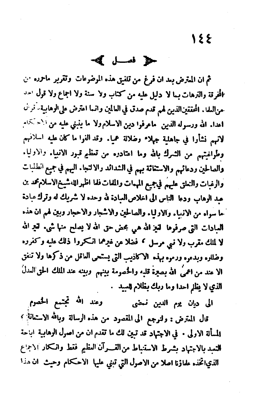 ثم إن المعترض بعد أن فرغ من تلفيق هذه الموضوعات وتقرير ما حرره من المخرقة والترهات بما لا دليل عليه من كتاب ولا سنة ولا إجماع ولا قول أحد من العلماء المحققين الذين لهم قدم صدق في العالمين وغنما اعترض على الوهابية بأقوال أعداء الله ورسوله الذين ما عرفوا دين الإسلام ولا ما ينبني عليه من الأحكام لأنهم نشأوا في جاهلية جهلاء وضلالة عمياء وقد ألفوا ما كان عليه أسلافهم وطواغيتهم من الشرك بالله وما اعتادوه من تعظيم قبور الأنبياء والأولياء والصالحين ودعائهم والاستغاثة بهم في الشدائد والالتجاء إليهم في جميع الطلبات والرغبات والتعلق عليهم في جميع المهمات والملمات فلما أظهر الله شيخ الإسلام محمد بن عبد الوهاب ودعا الناس إلى إخلاص العبادة لله وحده لا شريك له وترك عبادة ما سواه من الأنبياء والأولياء والصالحين والأشجار والأحجار وبين لهم أن هذه العبادات التي صرفوها لغير الله هي محض حق الله لا يصلح منها شيء لغير الله لا لملك مقرب ولا نبي مرسل، فضلاً عن غيرهما أنكروا ذلك عليه وكفروه وضللوه وبدعوه ورموه بهذه الأكاذيب التي يستحي العاقل من ذكرها ولا تتفق إلا عند من أعمى الله بصيرة قلبه والخصومة بينهم وبينه عند الملك الحق العدل الذي لا يظلم أحداً وما ربك بظلام للعبيد.