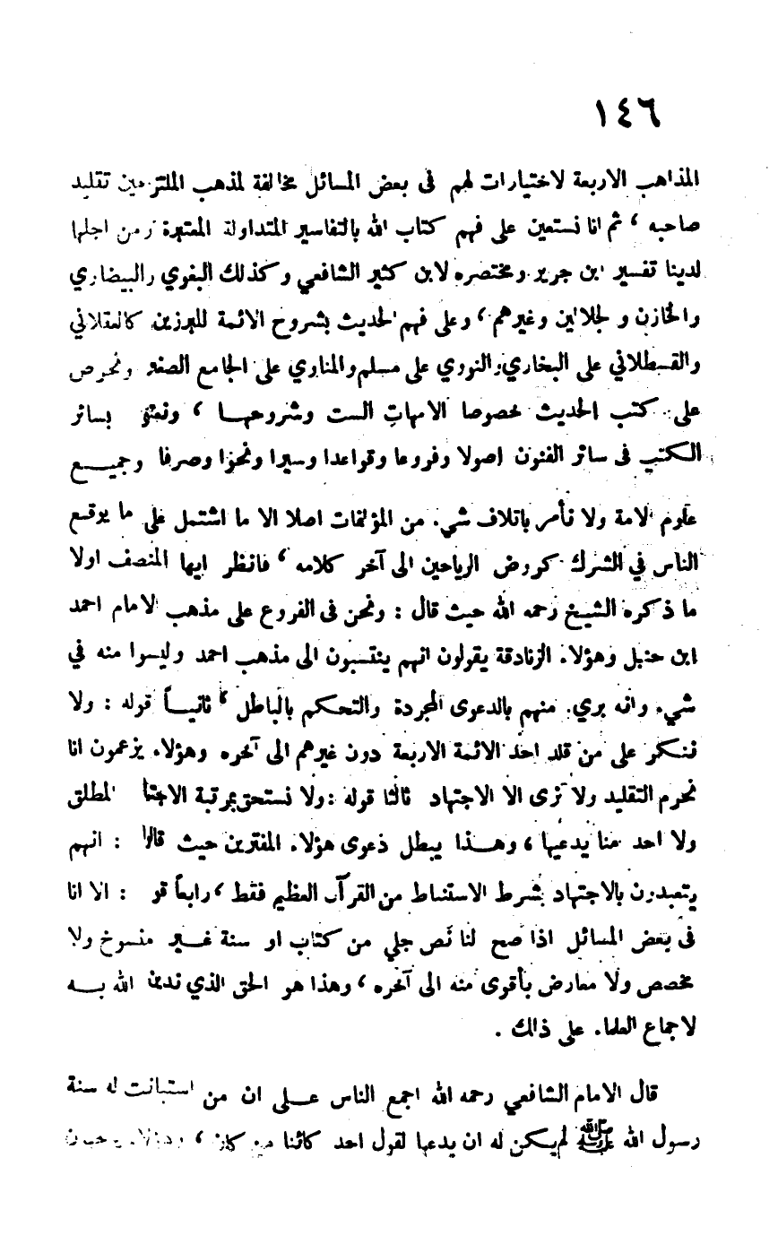 المذاهب الأربعة لاختيارات لهم في بعض المسائل مخالفة لمذهب الملتزمين تقليد صاحبه، ثم إنا نستعين على فهم كتاب الله بالتفاسير المتداولة المعتبرة ومن أجلها لدينا تفسير ابن جرير ومختصره لابن كثير الشافعي، وكذلك البغوي والبيضاوي والخازن والجلالين وغيرهم، وعلى فهم الحديث بشروح الأئمة المبرزين كالعسقلاني والقسطلاني على البخاري والنووي على مسلم والمناوي على الجامع الصغير ونحرص على كتب الحديث خصوصاً الأمهات الست وشروحها، ونعتبر بسائر الكتب في سائر الفنون أصولاً وفروعاً وقواعداً وسيراً ونحواً وصرفاً وجميع علوم الأمة ولا نأمر بإتلاف شيء من المؤلفات أصلاً إلا ما اشتمل على ما يوقع الناس في الشرك كروض الرياحين إلى آخر كلامه، فانظر أيها المنصف أولاً ما ذكره الشيخ –رحمه الله- حيث قال: ونحن في الفروع على مذهب أحمد وليسوا منه في شيء وأنه يرى منهم بالدعوى المجردة والتحكم بالباطل، ثانياً قوله: ولا ننكر على من قلد أحد الأئمة الأربعة دون غيرهم إلى آخره وهؤلاء يزعمون أنا نحرم التقليد ولا نرى إلا الاجتهاد، ثالثاً قوله: ولا نستحق بمرتبة الاجتهاد المطلق ولا أحد منا يدعيها، وهذا يبطل دعوى هؤلاء المفترين حيث قالوا: إنهم يتعبدون بالاجتهاد بشرط الاستنباط من القرآن العظيم فقط، رابعاً قوله: إلا أنا في بعض المسائل إذا صح لنا نص جلي من كتاب أو سنة غير منسوخ ولا مخصص ولا معارض بأقوى منه إلى آخره، وهذا هو الحق الذين ندين الله به لإجماع العلماء على ذلك.