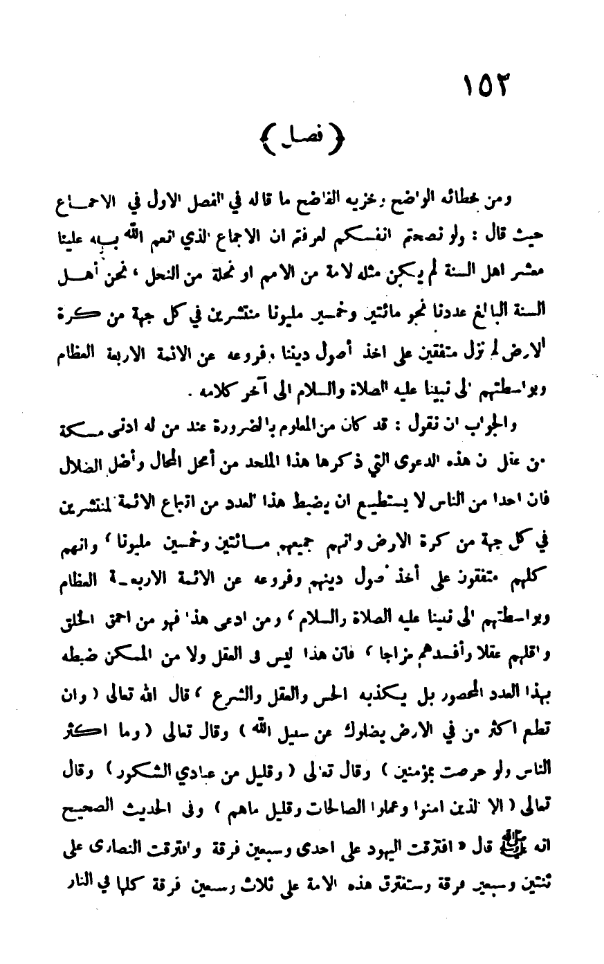 ومن خطئه الواضح وخزيه الفاضح ما قاله في الفصل الأول في الإجماع حيث قال: ولو نصحتم أنفسكم لعرفتم أن الإجماع الذي أنعم الله به علينا معشر أهل السنة لم يكن مثله لأمة من الأمم أو نحلة من النحل، نحن أهل السنة البالغ عددنا نحو مائتين وخمسين مليوناً منتشرين في كل جهة من كرة الأرض لم نزل متفقين على أخذ أصول ديننا وفروعه عن الأئمة الأربعة العظام وبواسطتهم إلى نبينا –عليه الصلاة والسلام- إلى آخر كلامه.