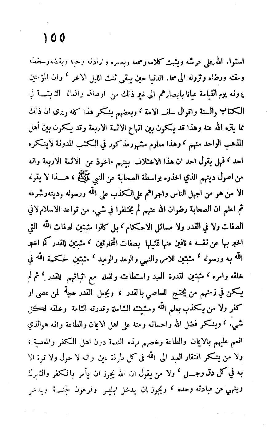 استواء الله على عرشه ويثبت كلامه وسمعه وبصره وإرادته وحبه وبغضه وسخطه ومقته ورضاه ونزوله إلى سماء الدنيا حين يبقى ثلث الليل الآخر، وأن المؤمنين يرونه يوم القيامة عياناً إلى غير ذلك من أوصافه وأفعاله الثابتة في الكتاب والسنة وأقوال سلف الأمة، وبعضهم ينكر هذا كله ويرى أن ذلك مما ينزه الله عنه وهذا يكون بين اتباع الأئمة الأربعة وقد يكون بين أهل المذهب الواحد منهم، وهذا معلوم مشهور مذكور في الكتب المدونة لا ينكره أحد، فهل يقول أحد أن هذا الاختلاف بينهم مأخوذ عن الأئمة الأربعة وأن من أصول دينهم الذي أخذوه بواسطة الصحابة عن النبي –صلى الله عليه وسلم-، هذا لا يقوله إلا من هو من أجهل الناس وأجرأهم على الكذب على الله ودينه وشرعه ثم اعلم أن الصحابة –رضوان الله عنهم- لم يختلفوا في شيء من قواعد الإسلام لا في الصفات ولا في القدر ولا في مسائل الأحكام، بل كانوا مثبتين لصفات الله التي أخبر بها عن نفسه، نافين عنها تمثيلها بصفات المخلوقين، مثبتين للقدر كما أخبر الله به ورسوله، مثبتين للأمر والنهي والوعد والوعيد، مثتبتين لحكوة الله في خلقه وأمره، مثبتين لقدرة العبد واستطاعته ولفعله مع إثباتهم للقدر، ثم لم يكن في زمنهم ومن يحتج للمعاصي بالقدر، ويجعل القدر حجة لمن عصى أو كفر ولا من يكذب بعلم الله ومشيئته الشاملة وقدرته التامة وخلقه لكل شيء، وينكر فضل الله وإحسانه وخصهم بهذه النعمة ومنه على أهل الإيمان والطاعة وأنه هنو الذي أنعم عليهم بالإيمان والطاعة وخصهم بهذه النعمة دون أهل الكفر والمعصية، ولا يمن ينكر افتقار العبد إلى الله في كل طرفة عين وأنه لا حول ولا قوة إلا به في كل دق وجل، ولا من يقول إن الله يجوز أن يأمر بالكفر والشرك وينهى عن عبادته وحده، ويجوز أن يدخل إبليس وفرعون الجنة ويدخل