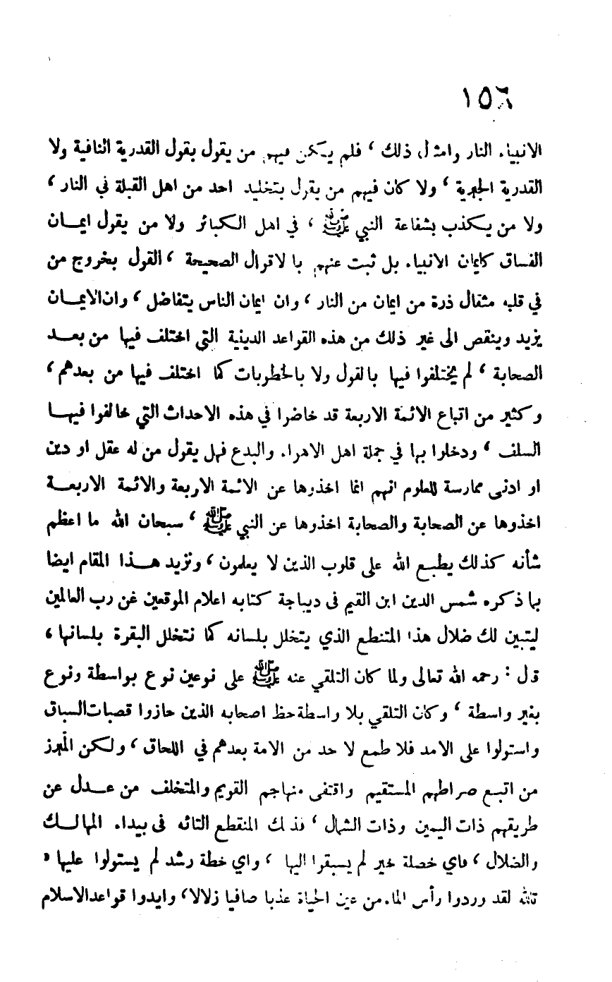 الأنبياء النار وأمثال ذلك، فلم يكن فيهم من يقول بقول القدرية النافية ولا القدرية الجبرية، ولا كان فيهم من يقول بتخليد أحد من أهل القبلة في النار، ولا من يكذب بشفاعة النبي صلى الله عليه وسلم، في أهل الكبائر ولا من يقول إيمان الفساق كإيمان الأنبياء بل ثبت عنهم بالأقوال الصحيحة، القول بخروج من في قلبه مثقال ذرة من إيمان من النار، وأن إيمان الناس يتفاضل، وأن الإيمان يزيد وينقص إلى غير ذلك من هذه القواعد الدينية التي اختلف فيها من بعد الصحابة، لم يختلفوا فيها بالقول ولا بالخطوبات كما اختلف فيها من بعدهم، وكثير من أتباع الأئمة الأربعة قد خاضوا في هذه الأحداث التي خالفوا فيها السلف، ودخلوا بها في جملة أهل الأهواء والبدع فهل يقول من له عقل أو دين أو أدنى ممارسة للعلوم أنهم إنما أخذوها عن الأئمة الأربعة والأئمة الأربعة أخذوها من الصحابة والصحابة أخذوها عن النبي –صلى الله عليه وسلم-، سبحان الله ما أعظم شأنه كذلك يطبع الله على قلوب الذين لا يعلمون، ونزيد هذا المقام أيضاً بما ذكره شمس الدين ابن القيم في ديباجة كتابه إعلام الموقعين عن رب العالمين ليتبين لك ضلال هذا المتنطع الذي يتخلل بلسانه كما تتخلل البقرة بلسانها، قال –رحمه الله تعالى-: ولما كان التلقي عنه –صلى الله عليه وسلم- على نوعين نوع بواسطة ونوع بغير واسطة، وكان التلقي بلا واسطة حظ أصحابه الذين حازوا قصبات السباق واستولوا على الأمد لأحد من الأمة بعدهم في اللحاق، ولكن المبرز من اتبع صراطهم المستقيم واقتفى منهاجهم القويم والمتخلف من عدل عن طريقهم ذات اليمين وذات الشمال، وذلك المنقطع التائه في بيداء المهالك والضلال، فأي خصلة خير لم يسبقوا إليها، وأي خطة رشد لم يستولوا عليها "تالله لقد وردوا رأس الماء من عين الحياة عذباً صافياً زلالاً، وأيدوا قواعد الإسلام