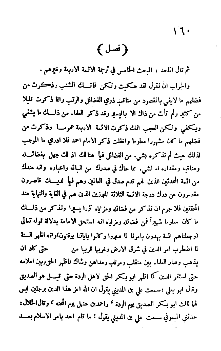 والجواب أن نقول لقد حكيت ولكن فاتك الشنب وذكر وذكرت من فضلهم ما لا يفي بالمقصود من مناقب ذوي الفضائل والرتب وإنما ذكرت قليلاً من كثير ولم تأت من ذاك إلا باليسير وقد ذكر العلماء من ذلك ما يشفي ويكفي ولكن العجب أنك ذكرت الأئمة الأربعة عموماً وذكرت من فضلهم ما كان مشهوداً معلوماً وأغفلت عن ذكر الإمام أحمد فلا أدري ما الموجب لذلك حيث لم تذكره بشيء من الفضائل فيما هنالك إذ لك جهل بفضائله ومناقبه ومقداره أم لشيء مما حاك في صدرك من أنبائه وأخباره وأنه عندك من أئمة المحدثين الذين لهم قدم صدق في العالمين وهم فيما لديك قاصرون مقصورن عن درك درجة الأئمة الثلاثة المبرزين الذين هم في الغاية والنهاية عند المحققين فلا جرم أن نذكر من فضائله ومزاياه نزراً يسيراً ونذكر من ذلك ما كان معلوماً شهيراً من فضائله ومزاياه أنك استحق الإمامة بدلالة قوله تعالى: {وَجَعَلْنَاهُمْ أَئِمَةً يَهْدُونَ بِأَمْرِنَا لَمَّا صَبَرُوا وَكَانُوا بِآيَاتِنَا يُوْقِنُونَ} وأنه أظهر السنة لما اضطرب أمر الدين في شرق الأرض وغربها قريباً من؟ حتى كاد أن يذهب وصار العلماء بين منقلب ومرتاب ومداهن وشاك فأظهر وشاك فأظهر الحق وبين أعلامه حتى استقر الدين كما أظهر أبو بكر الحق لأهل الردة حتى قيل هو الصديق وقال أبو يعلى: سمعت علي بن المديني يقول إن الله أعز هذا الدين برجلين ليس لهما ثالث أبو بكر الصديق يوم الردة، وأحمد بن حنبل يوم المحنة، وقال الخلال: حدثني الميموني سمعت علي بن المديني يقول: ما أقم أحد بأمر الإسلام بعد
