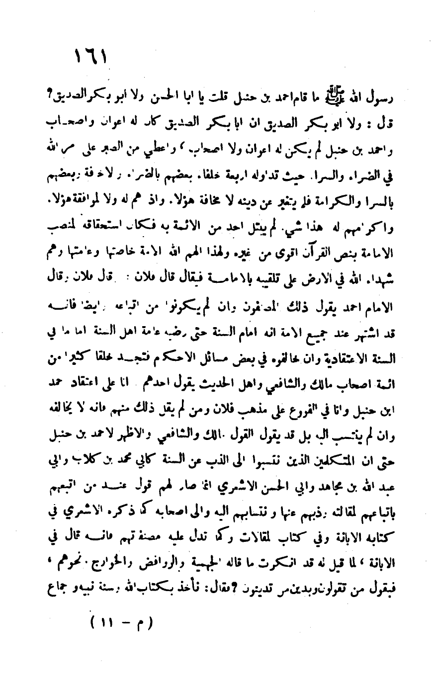 رسول الله –صلى الله عليه وسلم- ما قام أحمد بن حنبل قلت يا أبا الحسن ولا أبو بكر الصديق؟ قال: ولا أبو بكر الصديق إن أبا بكر الصديق كان له أعوان وأصحاب وأحمد بن حنبل لم يكن له أعوان ولا أصحاب، وأعطي من الصبر على أمر الله في الضراء والسراء حيث تداوله أربعة خلفاء بعضهم بالضراء ولا مخافة وبعضهم بالسراء والكرامة فلم يتغير عن دينه لا مخافة له. وإذ هم له ولا لموافقة هؤلاء وإكرامهم له هذا شيء لم يبتل أحد من الأئمة به فكان استحقاقه لمنصب الإمامة بنص القرآن أقوى من غيره ولهذا ألهم الله الأمة خاصتها وعامتها وهم شهداء الله في الأرض على ما تلقيبه بالإمامة فيقال قال فلان: قال فلان: وقال فلان وقال الإمام أحمد يقول ذلك المصنفون وإن لم يكونوا من أتباعه وأيضاً فإنه قد اشتهر عند جميع الأمة أنه إمام السنة حتى رضيه عامة أهل السنة إماماً في السنة الاعتقادية وإن خالفوه في بعض مسائل الأحكام فتجد خلقاً كثيراً من أئمة أصحاب مالك والشافعي وأهل الحديث يقول أحدهم إنا على اعتقاد أحمد بن حنبل وإنا في الفروع على مذهب فلان. ومن لم يقل ذلك منهم فإنه لا يخالفه وإن لم ينتسب إليه بل قد يقول القول مالك والشافعي والأظهر لأحمد بن حنبل حتى إن المتكلمين الذين انتسبوا إلى الذب عن السنة كأبي محمد بن كلاب وأبي عبد الله بن مجاهد وأبي الحسن الأشعري إنما صار لهم قول عند من اتبعهم باتباعهم لمقالته وذبه عنها وانتسابهم إليه وإلى أصحابه كما ذكره الأشعري في كتابه الإبانة وفي كتاب المقالات وكما تدل عليه مصنفاتهم فإنه قال في الإبانة، لما قيل له قد أنكرت ما قاله الجهمية والروافض والخوارج ونحوهم، فيقول من تقولون وبدين من تدينون؟ فقال: نأخذ بكتاب الله وسنة نبيه وإجماع