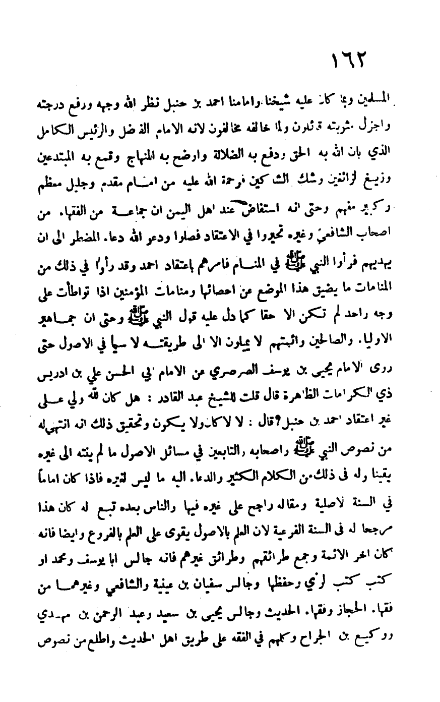 المسلمين وبما كان عليه شيخنا وإمامنا أحمد بن حنبل نضر الله وجهه ورفع درجته وأجزل مثوبته قائلون ولما خالفه مخالفون لأنه الإمام الفاضل والرئيس الكامل الذي بان الله به الحق ودفع به الضلالة وأوضح به المنهاج وقمع به المبتدعين وزيغ الزائغين وشك الشاكين فرحمة الله عليه من إمام مقدم وجليل معظم وكبير مفهم وحتى إنه استفاض عند أهل اليمن أن جماعة من الفقهاء من أصحاب الشافعي وغيره تحيروا في الاعتقاد فصلوا ودعوا الله دعاء المضطر إلى أن يهديهم فرأوا النبي –صلى الله عليه وسلم- في المنام فأمرهم باعتقاد أحمد وقد رأوا في ذلك من المنامات ما يضيق هذا الموضع إحصائها، ومنامات المؤمنين إذا تواطأت على وجه واحد لم تكن إلا حقاً كما دل عليه قول النبي –صلى الله عليه وسلم- وحتى أن جماهير الأولياء والصالحين وأئمتهم لا يميلون إلا إلى طريقته لا سيما في الأصول حتى روى الإمام يحيى بن يوسف الصرصري عن الإمام أبي الحسن علي بن إدريس ذي الكرامات الظاهرة قال قلت للشيخ عبد القادر: هل كان لله ولي على غير اعتقاد أحمد بن حنبل؟ قال: لا، لا، كان لا يكون وتحقيق ذلك أنه انتهى له من نصوص النبي –صلى الله عليه وسلم- وأصحابه والتابعين في مسائل الأصول ما لم ينته إلى غيره يقيناً وله في ذلك من الكلام الكثير والدعاء إليه ما ليس لغيره فإذا كان إماماً في السنة الأصلية ومقاله راجح على غيره فيها والناس بعده تبع له كان هذا مرجحاً له في السنة الفرعية لأن العلم بالأصول يقوى على العلم بالفروع وأيضاً فإنه كان آخر الأئمة وجمع طرائقهم وطرائق غيرهم فإنه جالس أبا يوسف ومحمد أو كتب كتب الرأي وحفظها وجالس سفيان بن عيينة والشافعي وغيرهما من فقهاء الحجاز وفقهاء الحديث وجالس يحيى بن سعيد وعبد الرحمن بن مهدي ووكيع بن الجراح وكلهم في الفقه على طريق أهل الحديث واطلع من نصوص