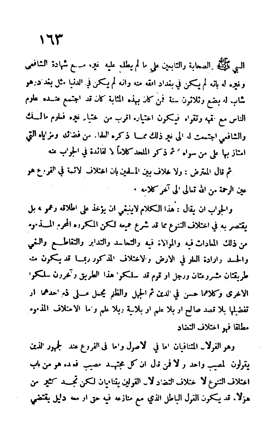 والجواب أن يقال: هذا الكلام لا ينبغي أن يؤخذ على إطلاقه وعمومه بل يقتصر به في اختلاف التنوع مما قد شرع جميعه لكن المكروه المحرم المذموم من ذلك المعاداة فيه والموالاة فيه والتحاسد والتدابر والتقاطع والبغي والحسد وإرادة العلو في الأرض والاختلاف المذكور ربما قد يكون منه طريقتان مشروعتان ورجل أو قوم قد سلكوا هذا الطريق وآخرون سلكوا الأخرى وكلاهما حسن في الدين ثم الجهل والظلم يحمل على ذم أحدهما أو تفضيلهما بلا قصد صالح أو بلا علم أو بلا نية أو بلا علم وأما الاختلاف المذموم مطلقاً فهو اختلاف التضاد.